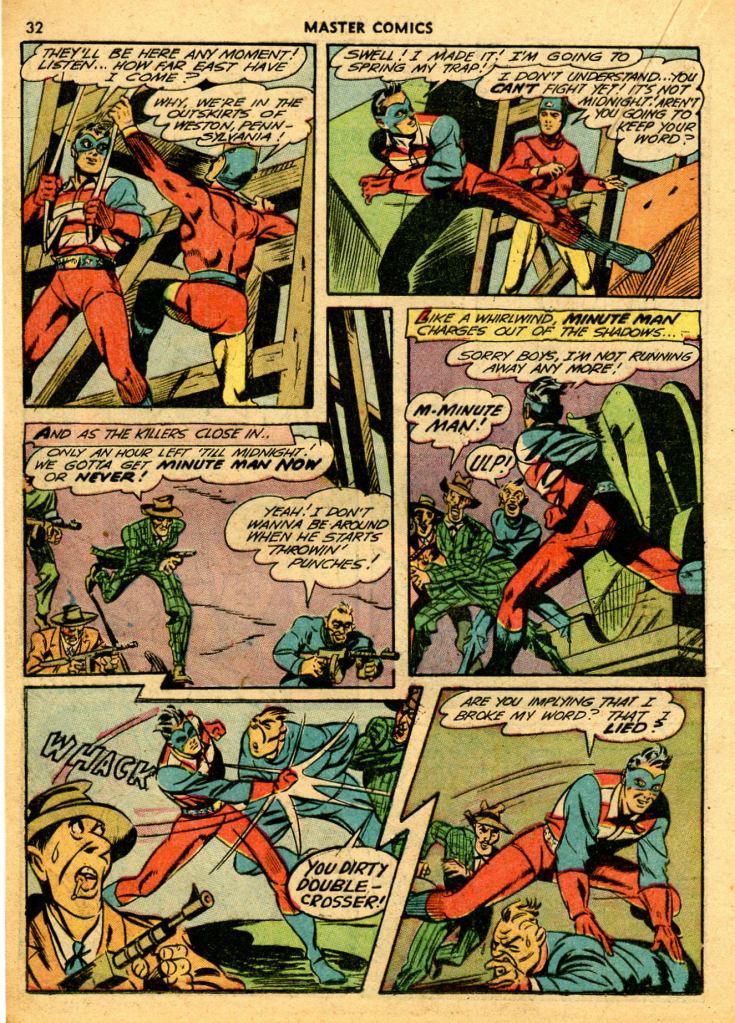 The main event should be done more fair on the hero side, and be a showcase for Minute Man as awesome. Not just evading the shooters physically, but psychologically manipulating them, playing them off against each other (“You gonna let him get the glory? What a ridiculous excuse you are!”). After all, getting criminals to kill each other is a proud Golden Age tradition. Any criminal who cheats loses immunity, so that keeps the scales a bit balanced.