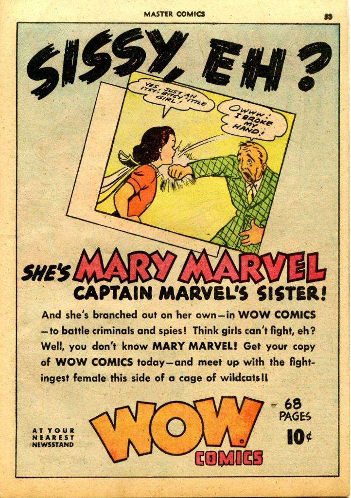 This issue also includes a house ad for the adventures of Mary Marvel in WOW COMICS, with a headline and some copy that really hasn’t aged well.