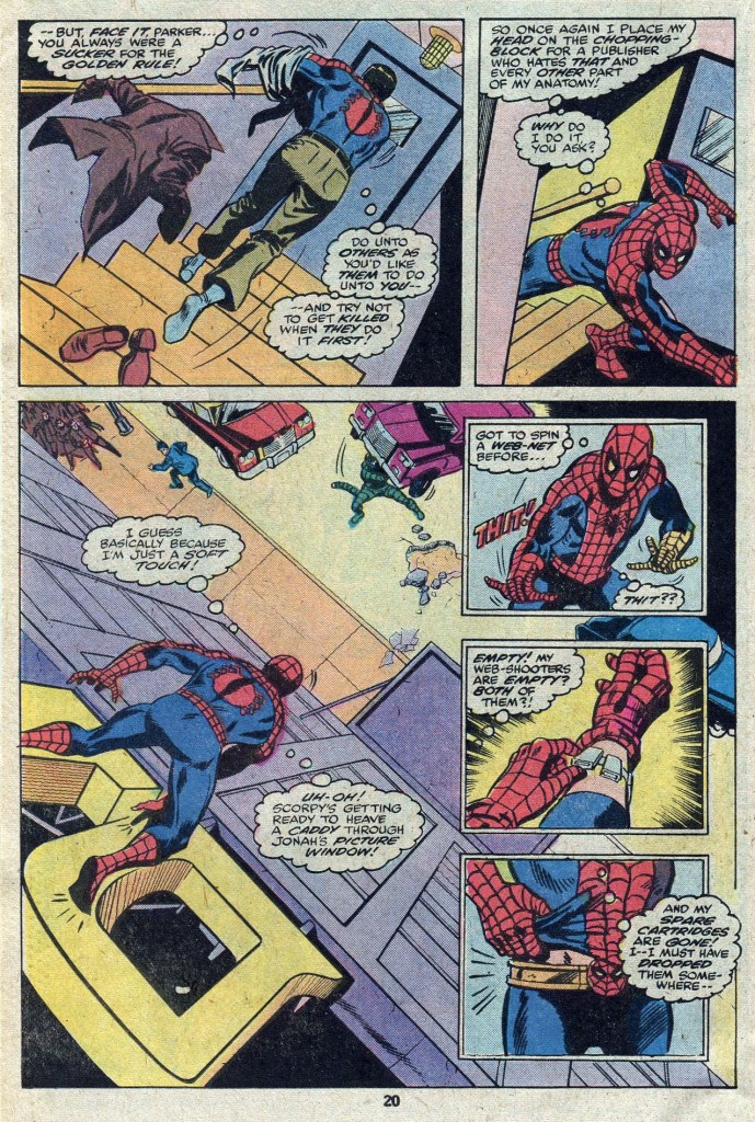 And here, we get to the punch line of the issue, as Spidey removes the Scorpion’s mask, indicating that the notion that he was forever trapped within his costume was all in his mind. Now, there’s a reading of this story where it’s that second exposure to Stillwell’s machinery that undoes the bond between Scorpion and costume–that’s certainly the way I see it looking at it now–but Mantlo doesn’t indicate anything of the kind, so we’ll have to take Spidey’s word for it: the Scorpion was simply delusional about the whole thing.