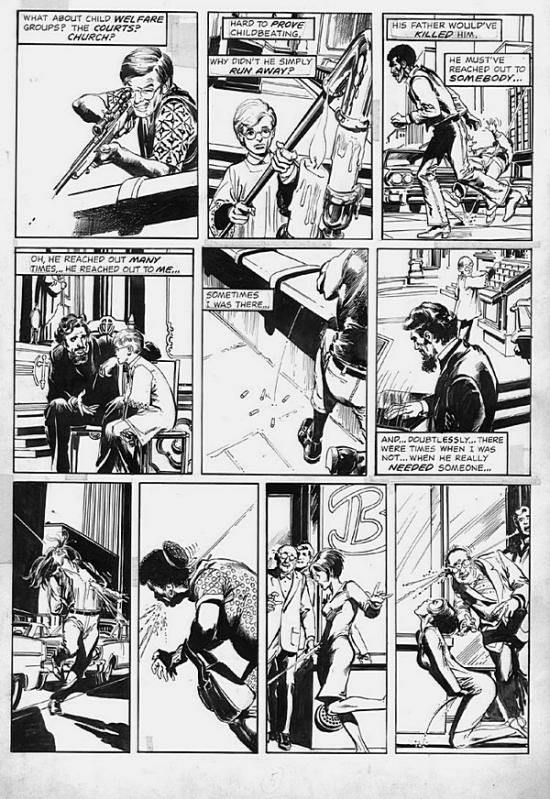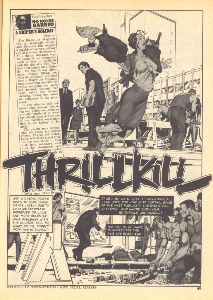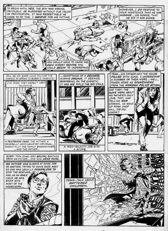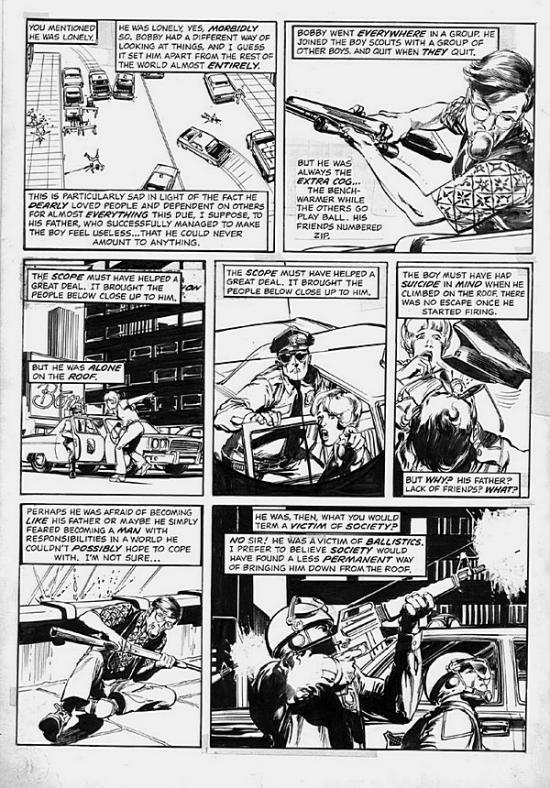 2. A very creepy story indeed, all the more so because while fictional it closely echoes too many events that have happened again and again in the world we live in. More chillingly, even if absolutely coincidentally, Adams’ sniper somewhat resembles a man who was a student at a high school in small town in Ohio in 1975 and who had serious psychological issues that no one would take serious note of until decades later, — decades even after he had committed his first murder after graduating from high school in 1979. Referring to Jeffrey Dahmer. Of course, Dahmer’s real story, as it played out, might have been too creepy even for Creepy magazine to deem publishable if someone had imagined and submitted it in 1975. But a story about a sniper? Already a tragic reality of the recent past that year, courtesy of Charles Whitman’s murderous rampage of 1966, murdering his wife and mother, then whoever happened upon his view as he took aim with his rifle from up on a tower. Well-written and great art by Adams, a grand-master of comics artistry.