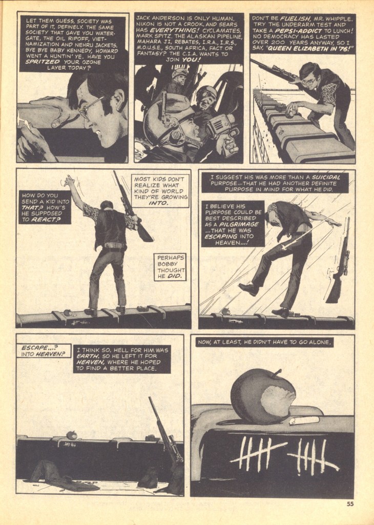 I have a vague recollection of reading this issue of Creepy magazine at some point in the mid-seventies – I figure the list of creators on the front cover would have been good reason for me to drop 30p on it – but not having the maturity or the knowledge of US events to understand / appreciate the story (or the references therein).