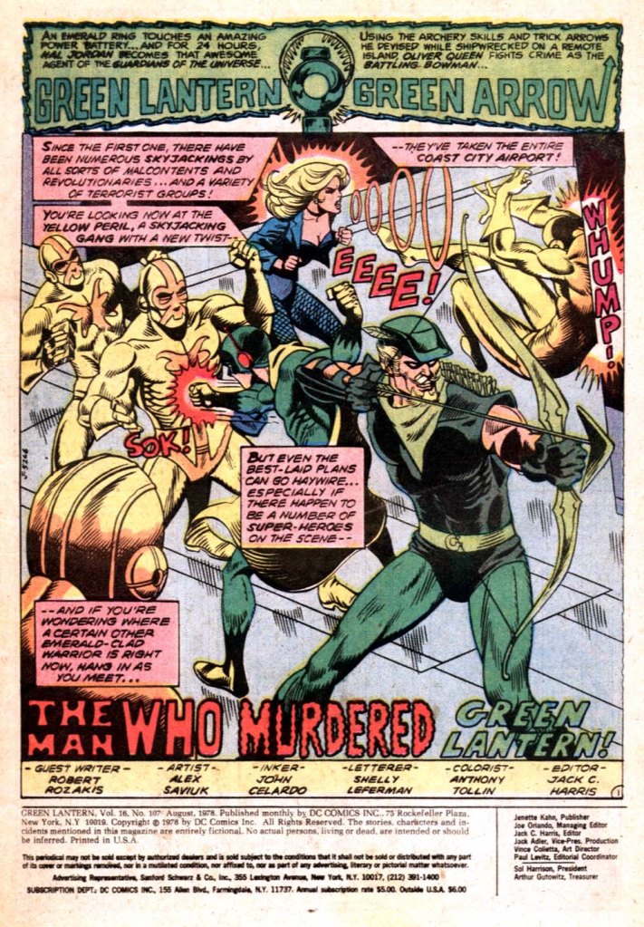 DC at this time was preparing for an upcoming expansion, what had been termed for marketing purposes the DC Explosion. All of their titles were going to increase their cover price to 50 cents (from 35 cents–as large a price jump as had ever taken place.) But as part of the expansion, the books would contain more pages–typically 25, rather than the 17 they had been sporting up to this point. They were going to manage this by introducing back-up series in all of the books–this is why Air Wave suddenly had a home in ACTION COMICS, for example. Now, the DC Explosion is best remembered for what happened immediately afterwards and why it failed–but we’re going to table that part of the conversation for the moment. In preparation for the expansion, editor Jack C. Harris had inaugurated a new back-up series, Tales of the Green Lantern Corps, which would focus on a different otherworldly Green Lantern in each story. As a preview–and in order to fill out the rest of this issue given its shortened lead tale–the first installment of the series was presented.