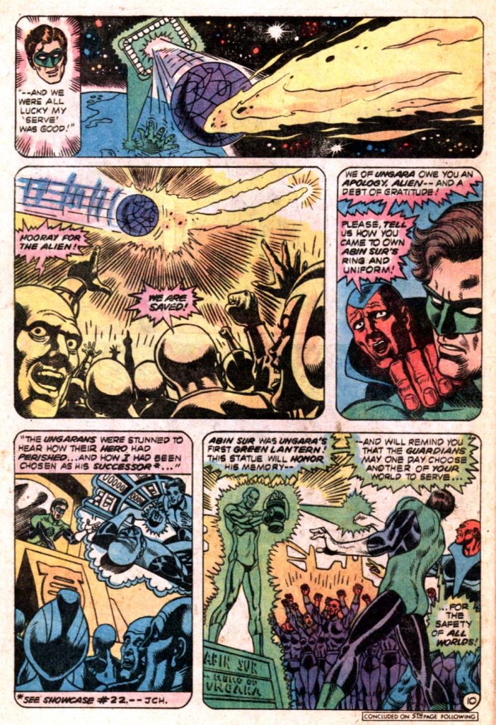 This whole story is related by Hal to Air Wave, Green Arrow and Black Canary as something that Hal went through yesterday, a means of justifying the framing sequence. There’s a massive yellow comet heading towards Abin Sur’s homeworld of Ungara–and since it’s yellow, Green Lantern’s power ring can’t affect it directly to adjust its trajectory. What’s more, the Ungarans not only don’t believe his story–their deep space scanners were created by Abin Sur’s ring, and so cannot detect the yellow comet–but they are convinced that this visitor to their world is the renegade Green Lantern, Sinestro (which is a nice touch.) As Hal attempts to convince them of the danger, they proceed to beat him to a pulp.