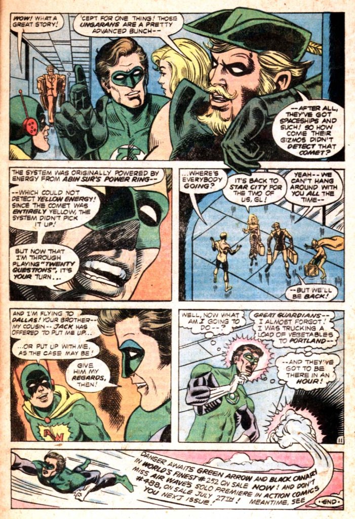 And, back in the present, Green Lantern wraps up his story, to thereafter inquire where all of his friends are going. It turns out that they’ve all got new series to be a part of: Green Arrow and Black Canary are being featured in WORLD’S FINEST COMICS, and Air Wave is going to become a back-up strip in ACTION COMICS. Not that this is going to prevent any of them from showing up in the issues ahead, particularly Green Arrow (who shared the logo with GL, after all.)