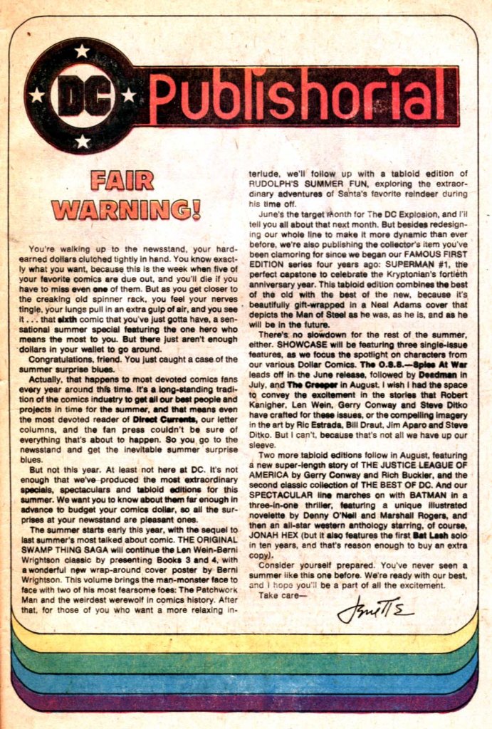 And this issue finished off with a new Publishorial from DC Publisher Jenette Kahn. This one doesn’t touch on the impending DC Explosion, but rather focuses on an array of other projects that DC had coming out that summer–including a few that didn’t quite make it, such as the JUSTICE LEAGUE OF AMERICA Treasury that’s promised (the story for it was later recycled into three issues of the monthly series.) There isn’t even a hint of the doom awaiting on the horizon at this point for DC–everything is positivity and optimism and great things to come. If they only knew.