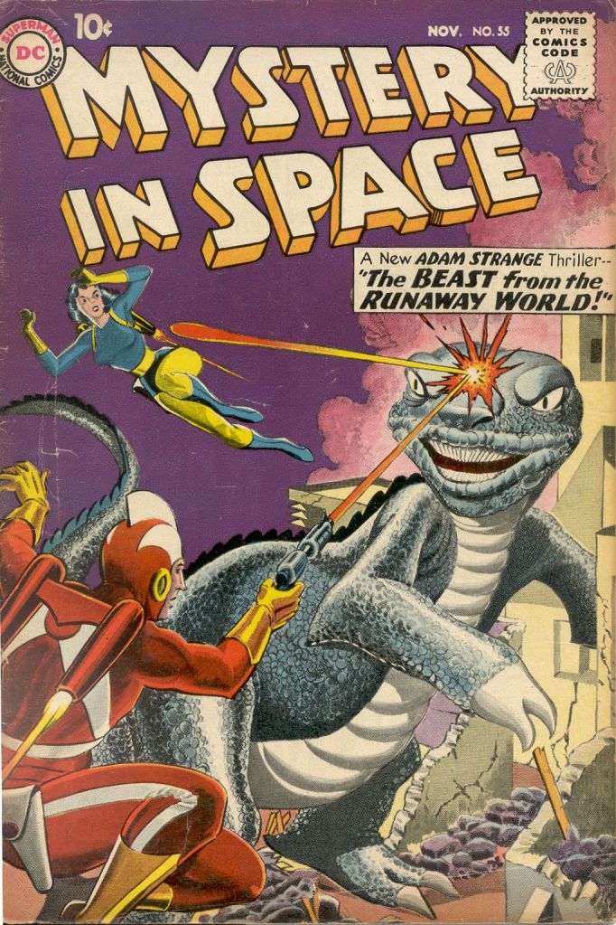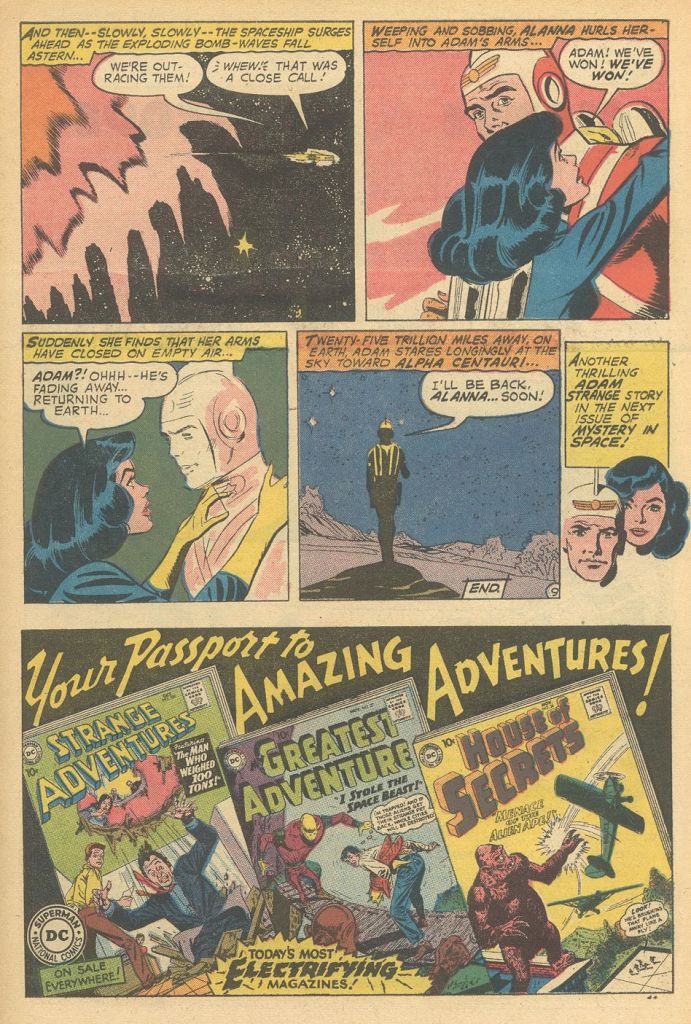 Adam Strange was essentially a super hero, but he was the thinking man’s hero, using his wits and scientific know-how to solve problems and get out of jams. In this short 9-page story, the Zeta-Beam strikes a creature out in space before it can reach Earth, bringing a new menace to Rann. Eight days later, when Adam can catch the next Beam, the creature is still there, causing mayhem (one would have expected the Zeta-Beam to have worn off by that point and sent the thing back into space.) The Zaradak (A Rannian word meaning “Terrible One”) repels any energy thrown against it, but Adam is able to deduce that it is simply hungry and is able to befriend the creature. When aliens threaten to bomb Rann, Adam plans to use the Zaradak against them–but it’s at this point that the Zeta-Beam wears off it, taking it out of the equation. No matter. Adam’s able to detonate the enemy bomb in space with his improved blaster–just before the Zeta-Beam wears off, sending him back to Earth. (It seems to last much longer for the Zaradak, something that would probably have been worth studying.)