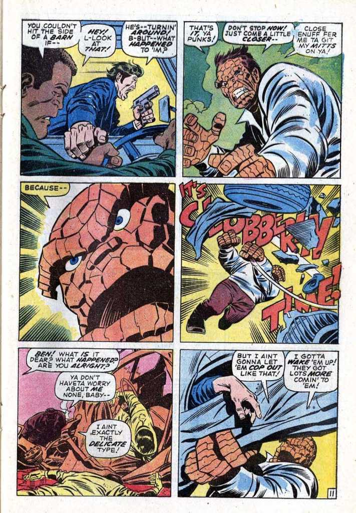 So what was going on in the story? Glad you asked. Last issue, Reed had begun yet another experiment to cure the Thing of his monstrous condition, only to be forced to halt the process in order to deal with another crisis. The Human Torch put Ben Grimm into suspended animation by drawing all of the heat within the room into his own body–but now, the danger has passed and Reed can finish what he’d begun. And this time, his process works to perfection. In fact, not only is Ben cured of being the Thing, but even better, he can transform himself back into his stony form simply by concentrating, in the same manner that Johnny could Flame On or Sue could go invisible. This would seem to be the best of all possible worlds, but there are misgivings right from the start. Ben’s personality begins to shift slightly. He becomes a bit nastier, a bit crueler–not enough where his teammates notice the change at first, but certainly his longtime girlfriend Alicia realizes something is wrong after Ben almost kills a team of hijackers whos path they cross.