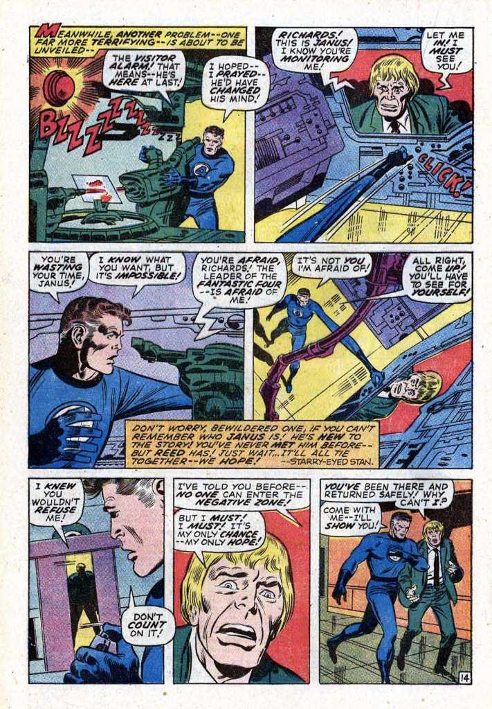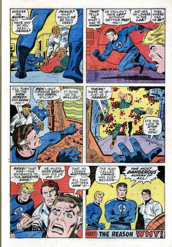 But that situation is a matter for another day. Because in the meantime, Reed gets a visit from a strange man named Janus, who wants to venture into the Negative Zone. Reed tells Janus that the Zone is simply too dangerous to be entered, but Janus zaps Reed with a concealed weapon, opens the airlock to the Zone, and goes through. There’s a strange caption indicating that Janus is a new character even though Reed already knows him, and that all will be revealed. The reason for this caption is that, before he left Marvel, Jack Kirby had drawn one more Fantastic Four story, based on a plot idea from Lee. But the end result wasn’t to Lee’s liking, and so the book was pulled. As you can guess, it featured Janus, in the guise of a new villain, the Mega-Man. The issue after this one, #108, would in fact repurpose big chunks of that unfinished issue, with additional bridging material provided by Buscema and John Romita. Some people over the years have claimed that this was done in order to have a new Jack Kirby book on the stands the same month that his new DC product came out, but that’s always seemed far-fetched to me, given the amount of advance notice and coordination that would be needed, and the non-return it would bring. No, I think this was simply a case of using up some inventory material that had already been bought and paid for.