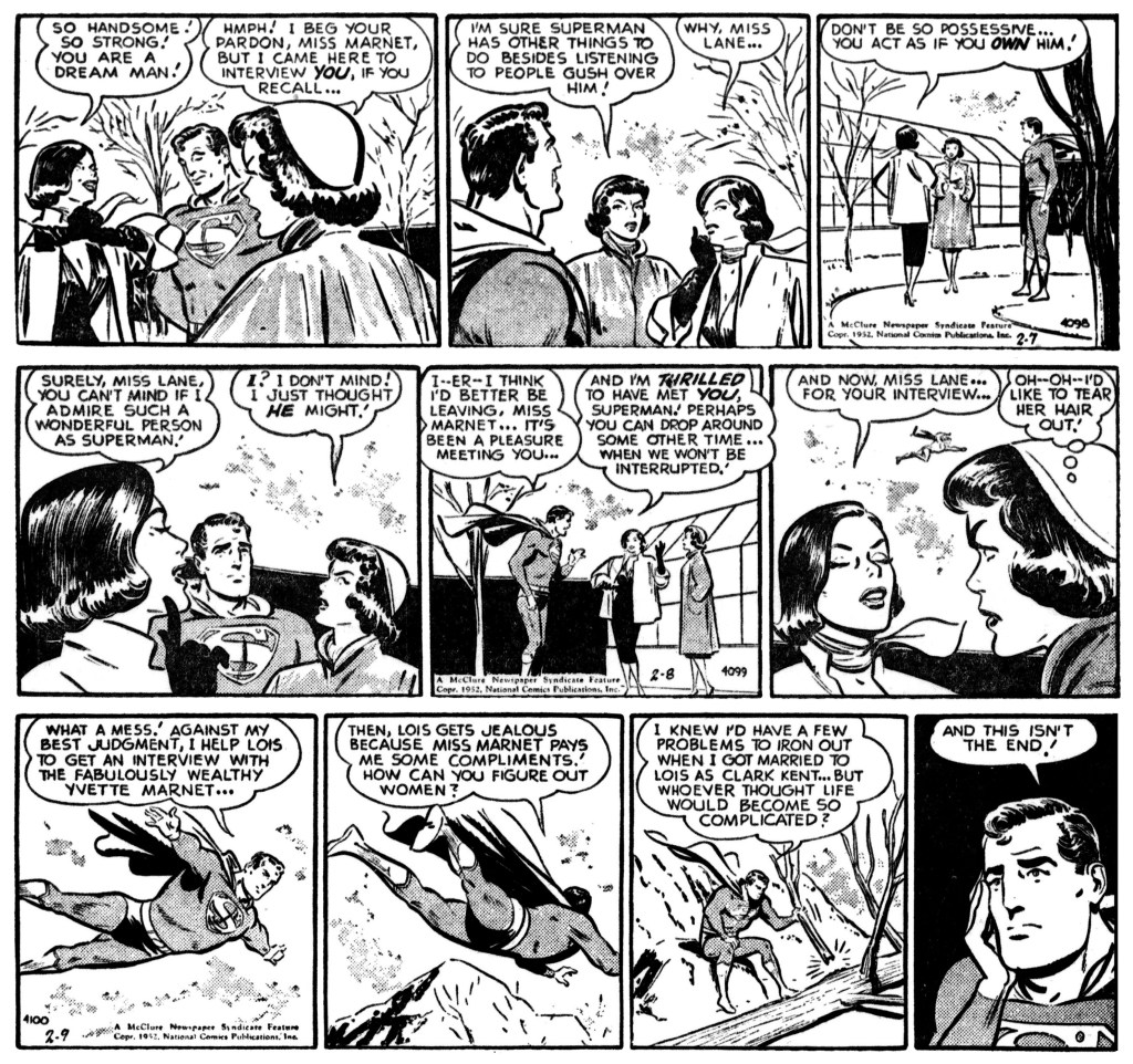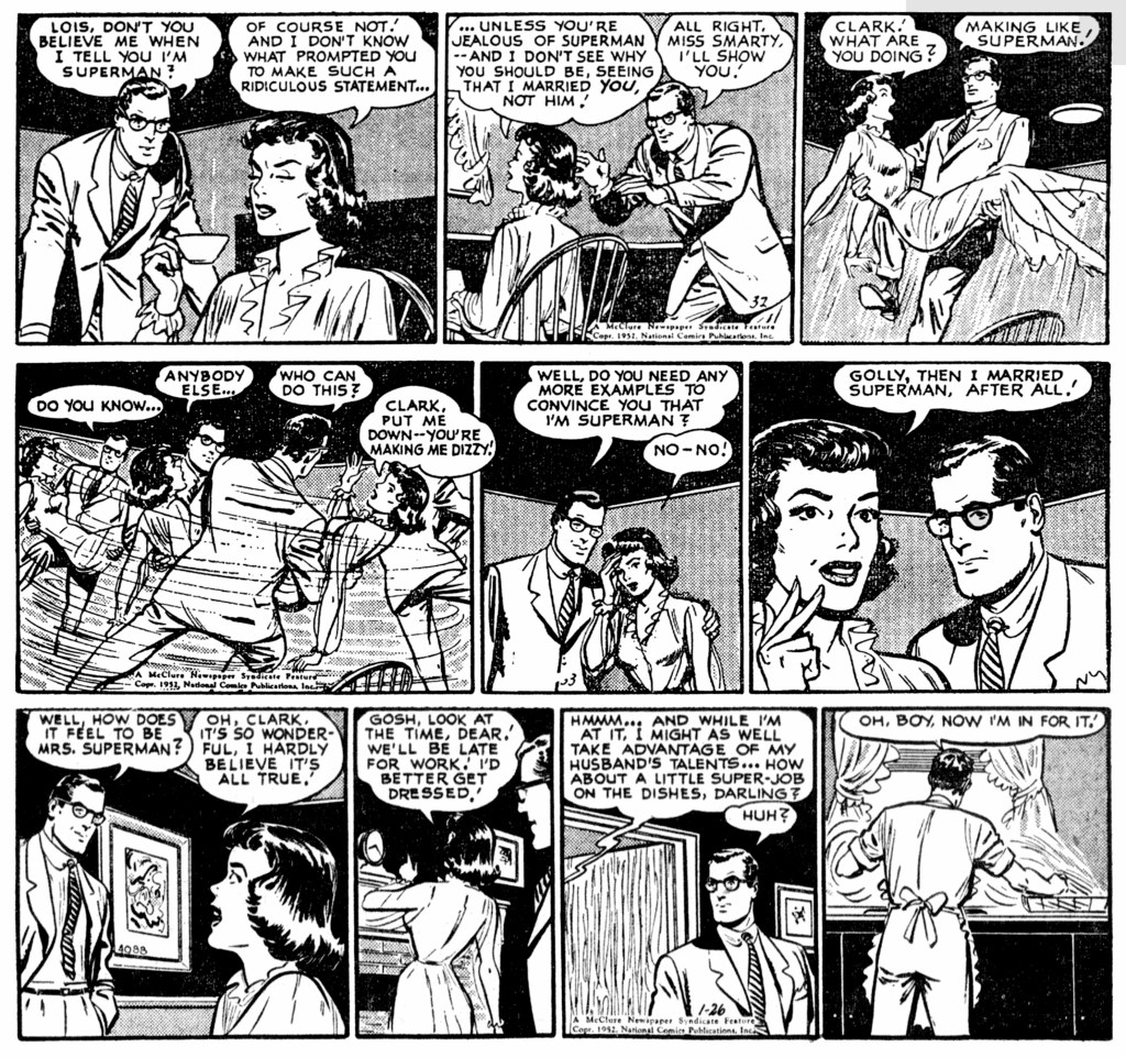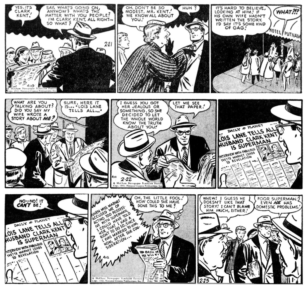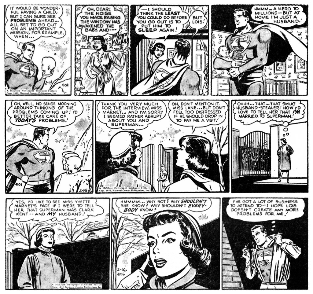 In the daily SUPERMAN newspaper strip, at the end of 1949, Clark Kent and Lois Lane got legitimately married. It was clear, looking at those strips, that the marriage was intended to be a dream on the part of Clark, but the strip got such a big publicity push out of it (and began picking up additional newspapers as clients) that they never got around to undoing it, at least not right away. For two solid years, while the fact wasn’t reflected in the comic books or on the radio show or in the serials, Clark Kent and Lois Lane were man and wife on the newspaper pages.