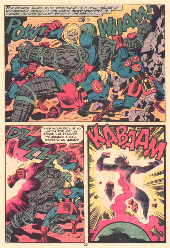 This particular issue is mostly an extended Kirby fight scene, which is always a certain amount of fun. Kirby definitely understood how to stage dramatic action. As the story opens up, from a crypt discovered below the city comesthe Deviant creation Dromedan, who had been imprisoned there for centuries due to his awesome power of mind-control. Three Eternals confront Dromedan–Ikaris, Makkari and the Prime Eternal, Zuras–with teh intention of burying him once again. But as they hurl their immortal powers against their foe, they quickly discover that Dromedan can manipulate vven their minds, and they are overcome in little time.