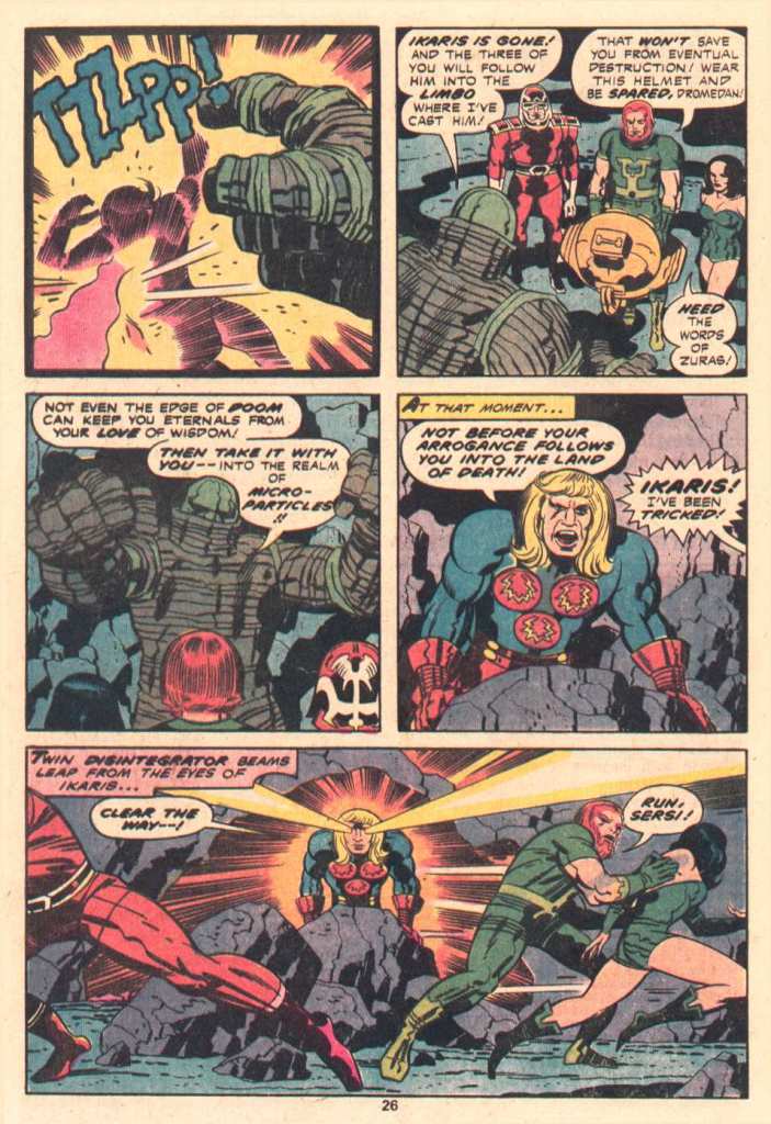Having isolated his target, Dromedan marshals his abilities for one final strike. Eternals can’t be killed, but they can be discorporated, and that is what Dromedan proceeds to do to Ikaris, disintegrating him utterly. As Dromedan pauses from this great effort, another Ikaris pops up from concealment–all of the Ikaris figures that attacked Dromedan were creations of Sersi, the true Ikaris was not among them. And with Dromedan’s power largely drained, the Polar Eternal is able to unleash his own optic beams to annihilate Dromedan. The text is very clear on this point, Ikaris shows no mercy, he kills Dromedan straight out. This was outside of the super hero code book in 1977, but Kirby followed a different set of rules, the rules of war. In the aftermath, the four Eternals renew their bonds of friendship, and it’s revealed that Zuras could have destroyed Dromedan at any time, but was hoping that he could be brought under control and rehabilitated. So Ikaris’ actions, while acknowledged as necessary, aren’t given the full stamp of approval.