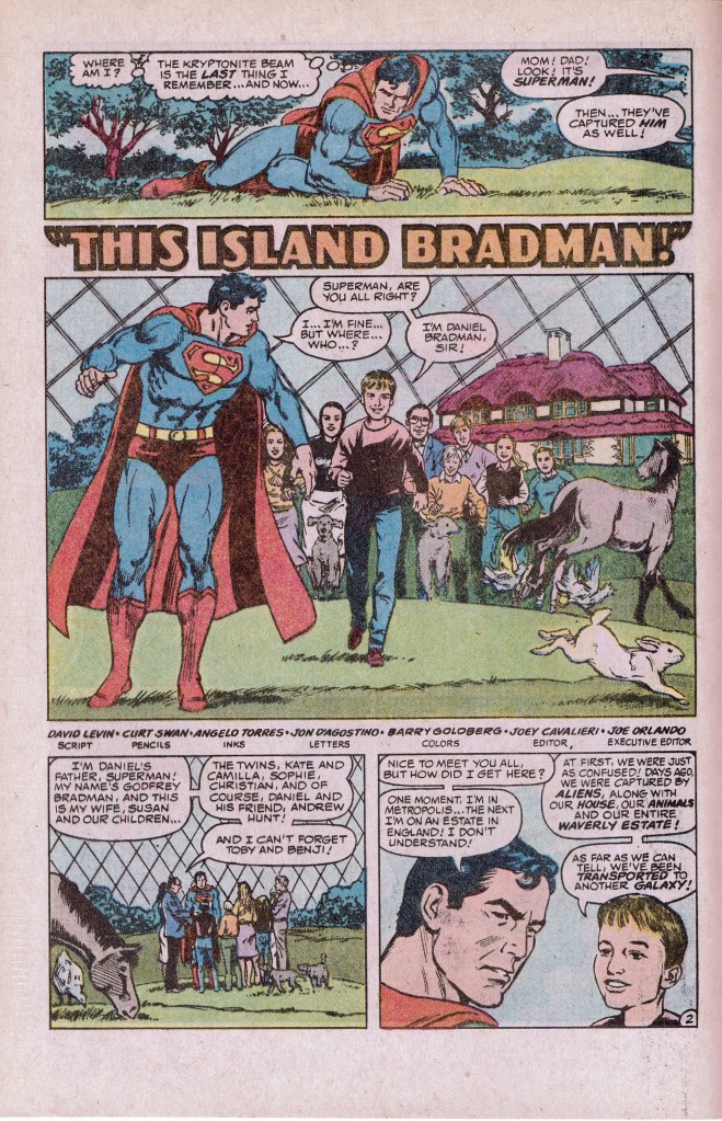The story was written by David Levin, who worked briefly for DC, and illustrated by famous Superman artist Curt Swan. As this was a custom comic, I’m guessing that the page rates were a bit richer than the norm for the work. (Bradman reportedly spent 10,000 pounds for the original comic.) Angelo Torres provided the inking.