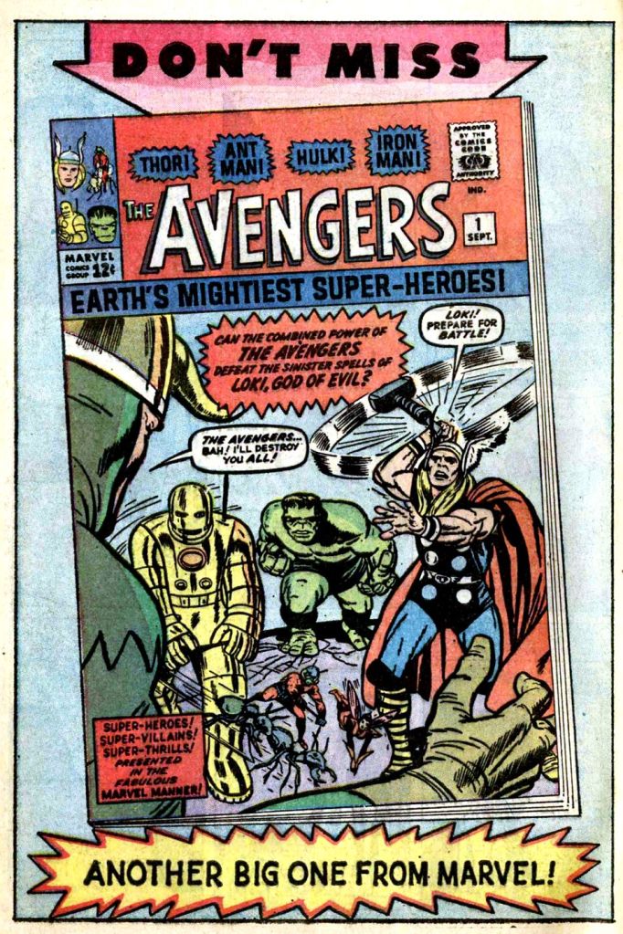 Quick pause for another house ad, this one for this year’s big Annuals, the first FANTASTIC FOUR ANNUAL and the second STRANGE TALES ANNUAL, which co-featured Spider-Man. (Spider-Man is spotlighted on both covers, a sure sign that the character was generating some heat, even this early.) And also, a quick plug for X-MEN, which doesn’t have art–making it perhaps more likely that it was conceived and started after AVENGERS.