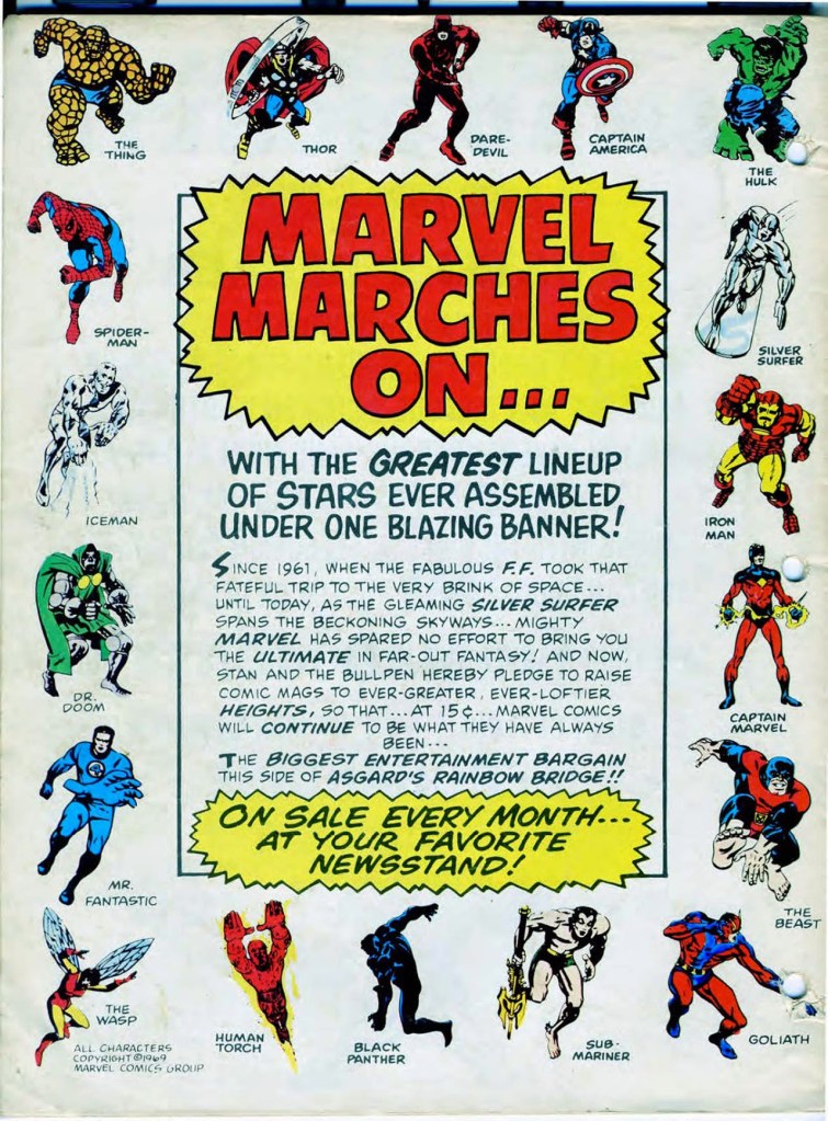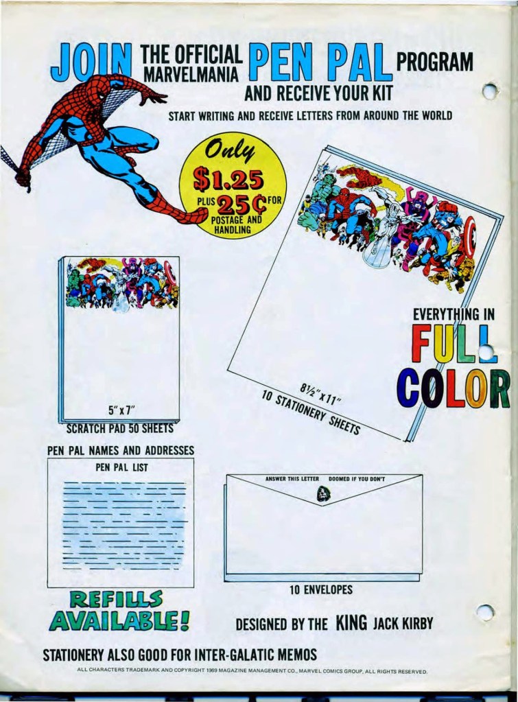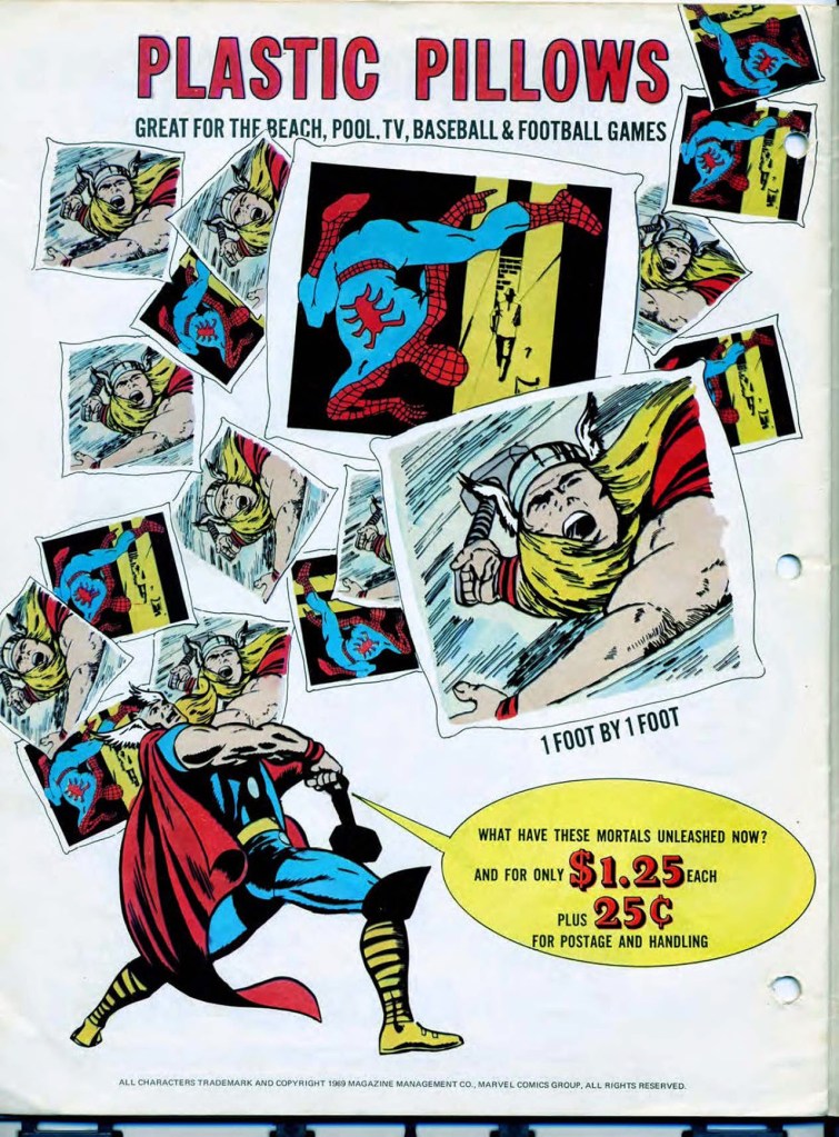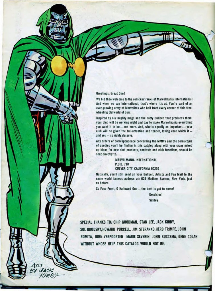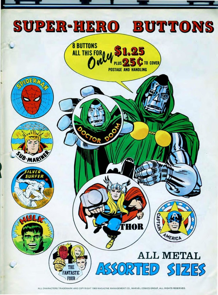 MARVELMANIA was a short-lived operation set up in 1969 to sell licensed merchandise of the Marvel characters. It was positioned in the books as a spiritual successor to the Merry Marvel Marching Society, Marvel’s in-house fan club, but in fact it was a separate fly-by-night organization entirely, one set up and licensed by Don Wallace. According to Mark Evanier, who worked for Marvelmania for a time, Wallace didn’t really know what he was buying here–he thought that Marvel was the publisher of the Captain Marvel of the 1940s, and he made several erroneous business calculations based on an imprecise understanding of the business and his audience. Eventually, Marvelmania folded around 1971, with Wallace running off with any remaining cash before his creditors could catch up to him. It wasn’t always guaranteed that you would receive the merchandise that you ordered through MARVELMANIA, but they did produce a very nice fanzine and product catalog. This is the first edition of the latter.
