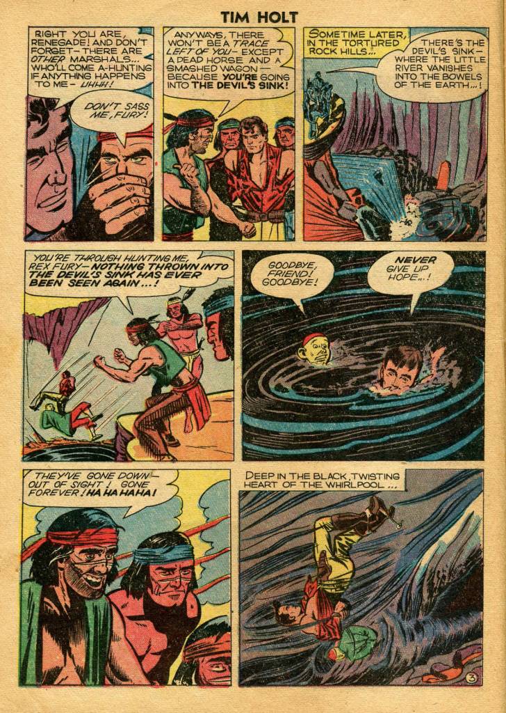And so, within the first three pages of this first Ghost Rider story, both Rex Fury and his sidekick, the unfortunately racist caricature Sing-Song are captured by badman Bart Lasher pretending to be an Indian, and thrown into the Devil’s Sink, a sargasso from which no one ever returns.