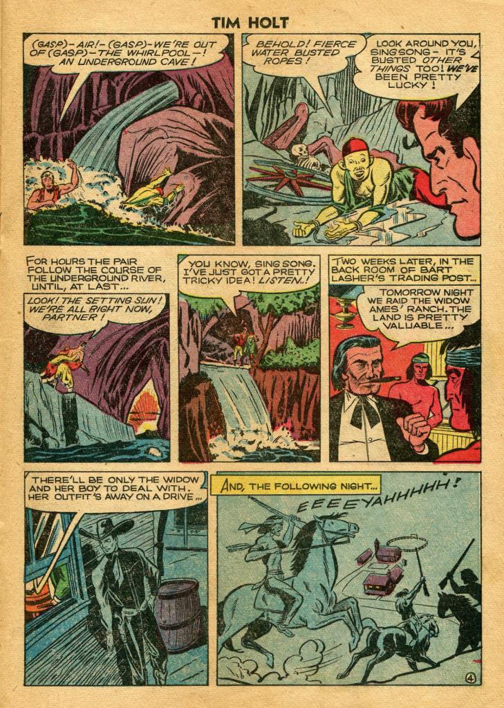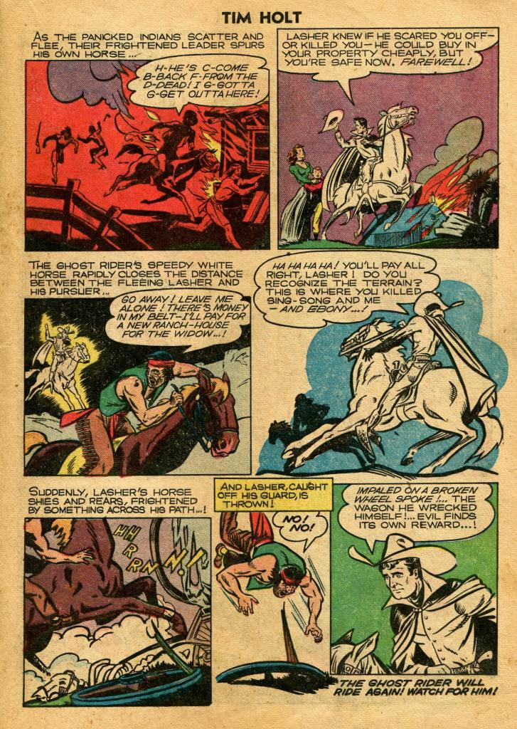 The original Ghost Rider made his debut in 1949, in the pages of Magazine Enterprises’ TIM HOLT #11. Nobody involved could have anticipated that the character, in a series of transformative forms, would still be a going concern today–and might have starred in a pair of big budget movies. While the publishers at Magazine Enterprises thought enough of the new character to give him a call-out on the cover, the Ghost Rider was actually created to try to save an ailing strip.