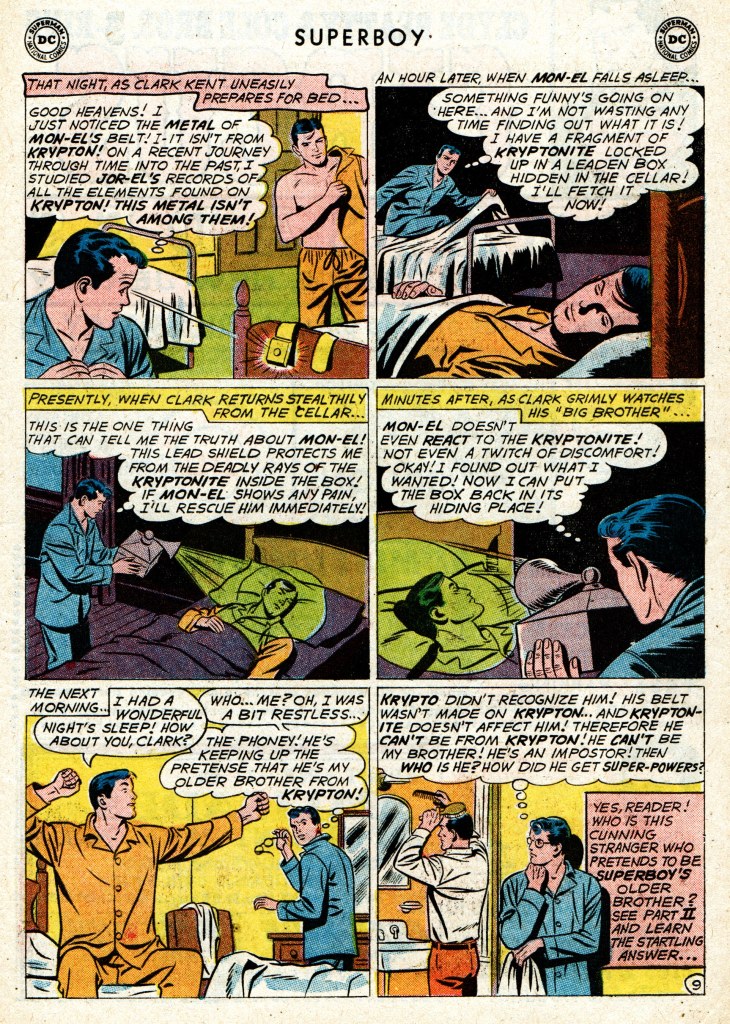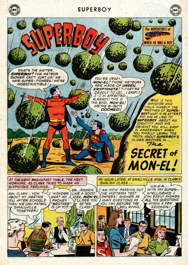Given its provenance, it’s an almost certainty that editor Weisinger assigned this story to its writer, Robert Bernstein. Artwork was provided by George Papp, whose style I never really warmed to. Certain artists are described as being wooder–in Papp’s case, his characters often looked as though they had ben carved out of wood, at least to my eye. Anyway, the story concerns the arrival of a stranger from space, whom all evidence points to being the older brother of Superboy, also sent from Krypton by their parents Joe-El and Lara. The stranger has amnesia, so Superboy and his Earth parents name him Mon-El since he arrived on a Monday. They also set him up with teh secret identity of Bob Cobb, traveling salesman, to explain his sudden appearance to their neighbors in Smallville. And at first, all is well, and Superboy is overjoyed to have a sibling who shares his tremendous powers and loneliness as the last survivor of a doomed planet. But as time goes on, clues begin to crop up that Mon-El isn’t all that he seems to be. He isn’t vulnerable to Kryptonite, for one thing, which is a bit of a red flag. So what’s his deal?
