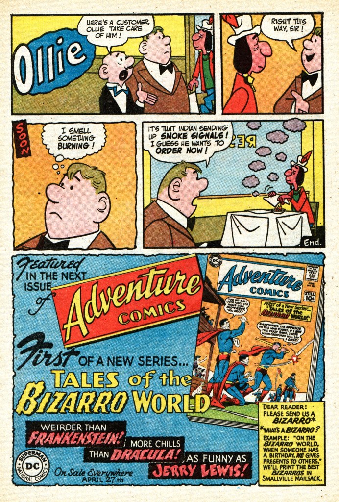 And rather than simply getting a blurb in one of editor Weisinger’s Coming Super-Attractions ads, te debut of the Tales of the Bizarro World series in ADVENTURE COMICS rates an entire half-page ad all by itself. It’s another typographical tour-de-force by letterer Ira Schnapp. The feature would run for 15 issues until it was displaced by the aforementioned Legion of Super Heroes.