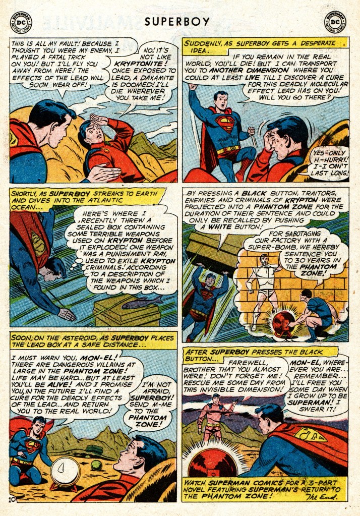 Sure enough, when the Kryptonite starts to fall, Mon-El gasps in pain and keels over. Superboy reveals his ruse and calls Mon-El out on it. But the joke, such as it is, is on the Boy of Steel. Because the intense pain of Lead Poisoning has brought back Mon-El’s memory, and he’s able to explain that he isn’t actually Superboy’s brother at all, but rather a visitor from a neighboring planet, Daxam, whom Jor-El and Lara had once helped. Daxamites like himself gain similar powers to Superboy under a yellow sun, but they are vulnerable to lead–and the damage done is permanent. (Mind you, the sleeping Mon-El had no reaction when Superboy exposed him to Kryptonite in a Lead box, an oversight by Bernstein and Weisinger.) So thanks to his suspicion and jealousy, Superboy has killed Mon-El, the jerk! As a last ditch measure, Superboy recovers an object that had been featured in a recent story–remember how I mentioned Weisinger was building a connective mythology–the Phantom Zone projector, the gateway to an immaterial dimension where Krypton’s worst villains were imprisoned. Superboy projects Mon-El into it, figuring that his lead poisoning won’t progress while he is ephemeral, and this will give him the time needed to find a cure. In actuality, it will take 1000 years for somebody to eventually figure out how to heal and restore Mon-El, but he’ll become a recurring figure in any Phantom Zone stories from this point forward.