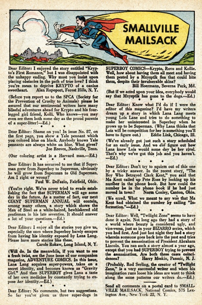 Time out here for the Smallville Mailsack, the title’s letters page. A regular letters page was still a relatively new development in these days, and its clear from those letters that were printed that Weisinger was cultivating a very specific sort of letter-writer. They were often young relative to those in other comics, they often tried to catch the editor out on mistakes (or “boo-boos” as they became known) in recent stories, and they were a font of prospective ideas for future stories.