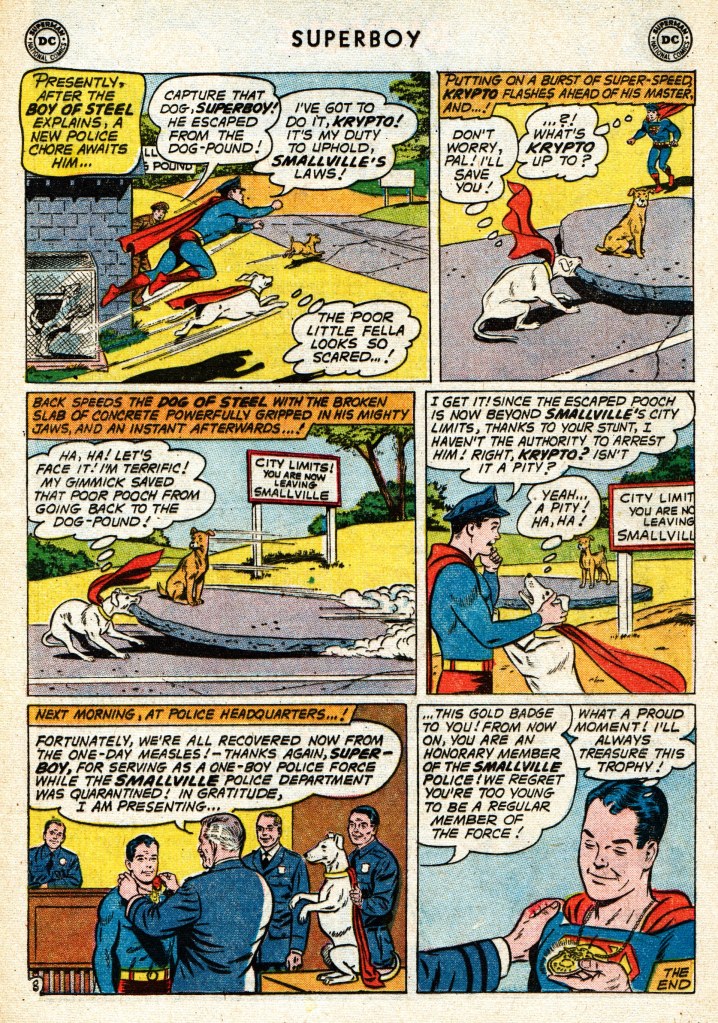 The story has a very simple premise, and is more interested in clever incident than in conflict. After a bout of one-day measles sidelines the entire Smallville police force, Chief Parker deputizes Superboy as a one-man Police Department to fill in for the day. So the Boy of Steel spends his time ticketing speeding motorists, breaking up craps games, exposing crooked beggars and even hunting down unlicensed stray dogs. Fortunately, Smallville is a pretty quiet place overall, and a day later the Police Department has recovered enough to do their own jobs again. But Superboy is given a citation making him an honorary member of the force in perpetuity for his actions. And that’s it. It’s a very storybook-style outing, as was a lot of the Super-titles’ output in this period, charming but not especially thrilling. But for an imaginative child, this stuff was like candy.