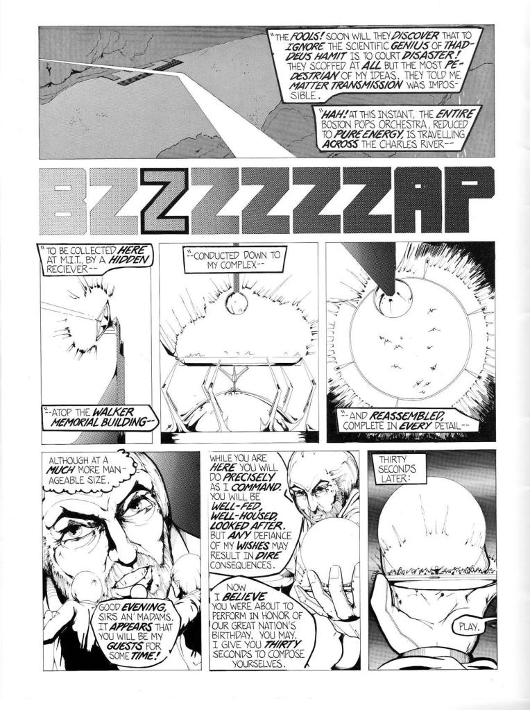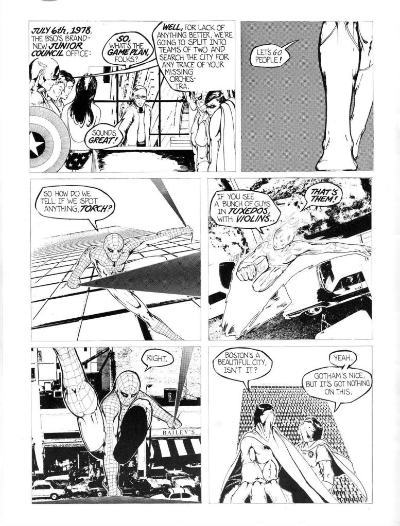 The story concerns the Symphony Orchestra being kidnapped, with the super heroes of both Marvel and DC called upon to locate and recover the purloined musicians. Thanks to the reputation of the Boston Pops, both Marvel and DC gave permission for their characters to be used in the joint venture, provided (as mentioned earlier) that all remaining copies were destroyed immediately thereafter. DC President Sol Harrison was in attendance for the performance–and presumably to make sure that the terms of the deal were met. According to Busiek, “He was seated at the same table as Scott, Chris and me, but he wouldn’t talk to us. I expect he just liked the idea of attending the Pops opening concert of the year, which was a reasonably-prestigious event.”
