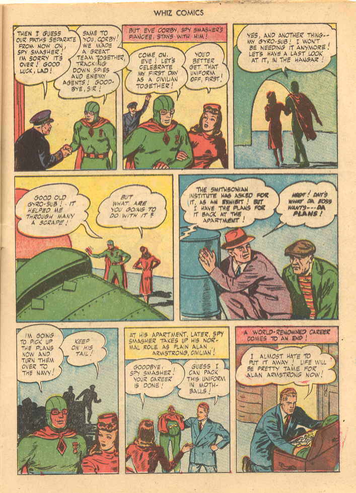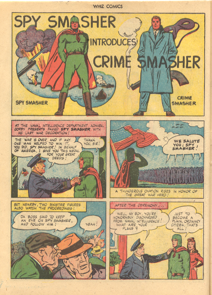Everything was going along really well for good ol’ Spy Smasher–and then, the danged war ended! Like Captain America and so many other patriotic-themed super heroes of the age, Spy Smasher’s raison detre had been taken from him, and he needed to find a way to go on, some replacement that would give him purpose on the home front.