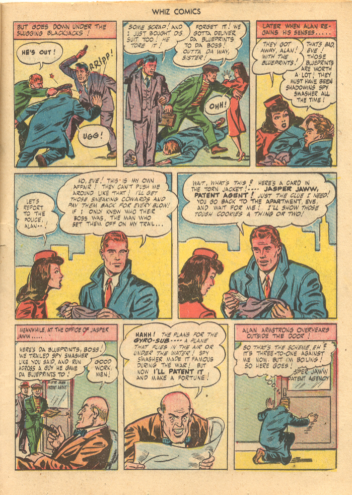 The story was written by Fawcett’s backbone writer in the postwar period Otto Binder, and illustrated by Al Carreno. In it, Alan Armstrong is mustered out of Naval Intelligence, returning to civilian life along with his recurring girlfriend Eve Colby. But when criminals seek to steal the secret to his no-longer-needed-in-the-war-effort Gyro-sub, Armstrong gets back into harness in order to stop them from making off with the craft’s secret.
