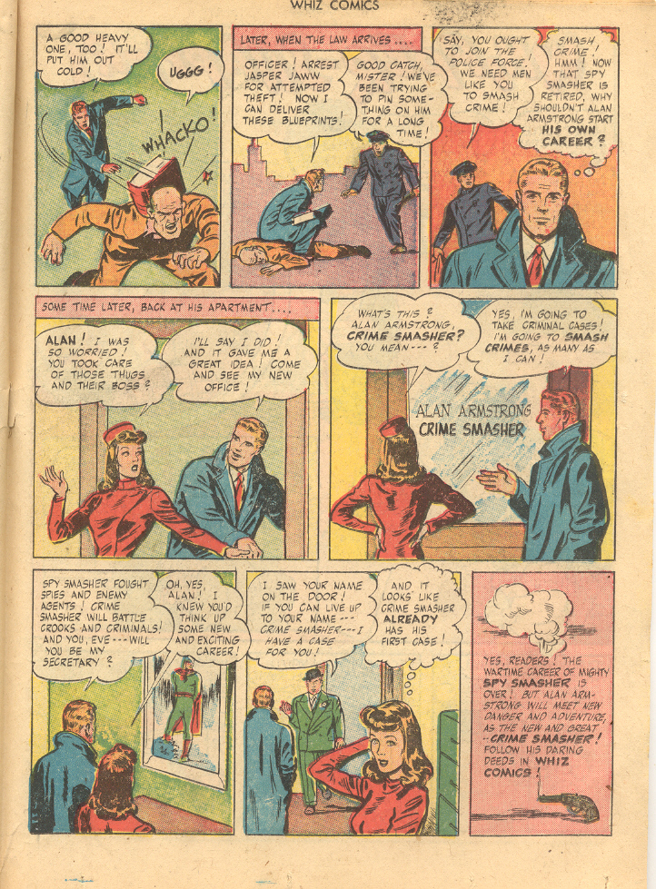 After several months where this situation was simply sidestepped and Spy Smasher continued to battle spies and saboteurs working in the employ of enemy powers that had by that time surrendered, finally in the pages of WHIZ COMICS #76 in 1946 was a transformation made. Alan Armstrong put away his costumed aviator’s disguise in favor of a trench coat back within the U.S. and took on the new identity as Crime Smasher.