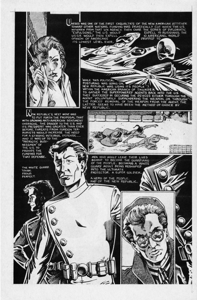 It was no surprise when Solson Publications announced their own entry in the great THUNDER Agents Revival Sweepstakes. Because if there was a bottom-feeder publisher in the mid-1980s, it was definitely Solson. The outfit was founded by Gary Brodsky, the son of Marvel Comics artist and production man Sol Brodsky. Like his father, Gary wanted to get into publishing in the worst way. And that’s exactly what he did. Beginning in 1986, Solson came out with an incredible number of absolute shlock comics, books that weren’t anywhere near professional quality, with lousy concepts, amateurish artwork and ill-considered ideas. The perennial Solson comic book series was REAGAN’S RAIDERS, which cast Ronald Reagan and members of his cabinet as super heroes in the most tone-deaf manner possible. In an era of fly-by-night black and white shlock publishers, Solson was the shlockiest.