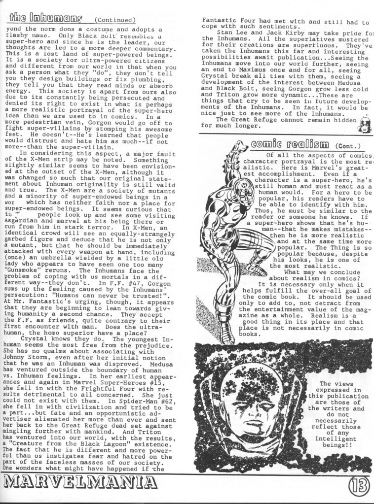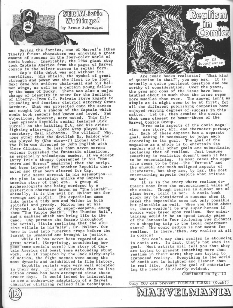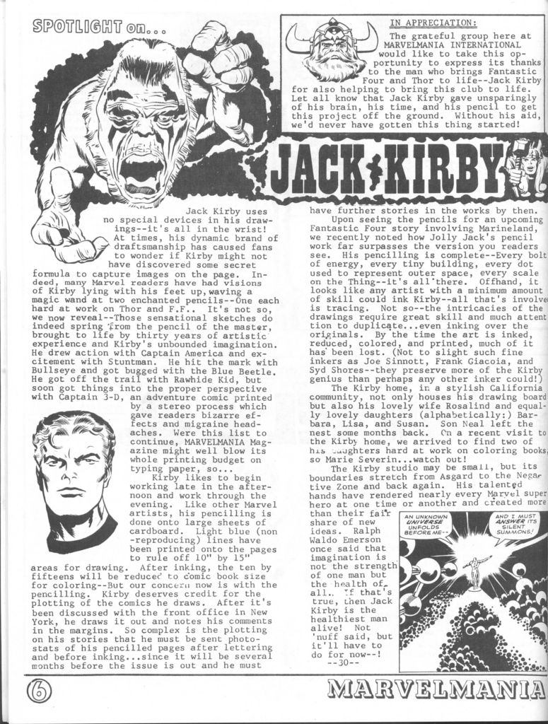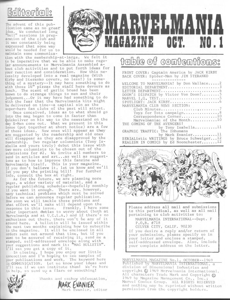 one of the new club’s endeavors was to put out a regular Marvel-themed fanzine, a subscription to which would be included with club membership. In this way, Wallace could continue to hawk the licensed products that were the backbone of his fiscal operation and maintain the attention of the audience of consumers. Wallace wound up hiring local fans Mark Evanier and Steve Sherman to put the fanzine together (though it certainly appears that Evanier did all of the work on this initial version himself, with Sherman only contributing a solicited letter of comment.) . In all, six issues were published, with two different editions of issue #4 (due to Evanier and Sherman quitting when they discovered Wallace’s shady business practices) and two different editions of #1. This was the first one, considered issue #0 these days. Jack Kirby contributed a new piece of artwork featuring Captain America for its cover.
