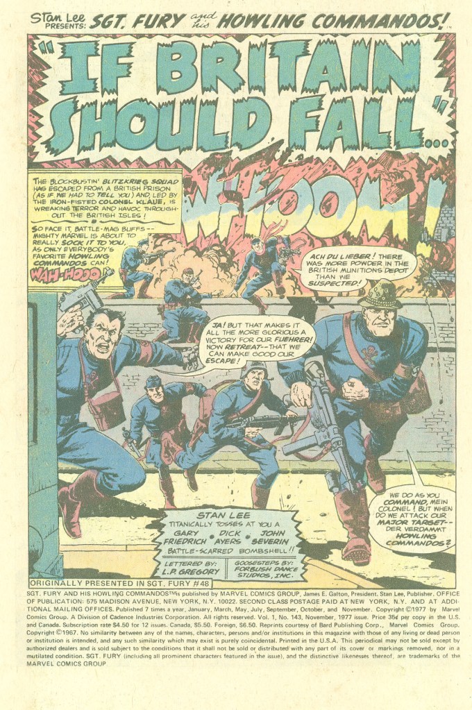 This story featured the return of the Blitzkrieg Squad, a kind of Axis opposite number to the Howling Commandos made up of soldiers specifically chosen to counter the Howlers’ particular strengths. So their ranks contained a strong man, a musical, a duelist, and so forth. Originally, the group had been assembled by Baron Strucker, but strucker had gone on to become a more important villain on his own both in the SGT FURY series and NICK FURY, AGENT OF S.H.I.E.L.D. So here, he’s replaced by Colonel Klaue, who sports an artificial hand made out of steel. Despite this, there wasn’t any relationship between him and the Fantastic Four’s recurring for Ulysses Klaw of which I’m aware (or if there was, it was established many years later.) The issue opens with the Blitzers escaping from a British prison, contacting the homeland, and being given the mission of eliminating the Howlers. The Nazis have an invasion force all ready to sweep into England and capture the home base of the First Attack Company–they just needed a bunch of guys to be the spearhead of the attack, and the Blitzers are it.