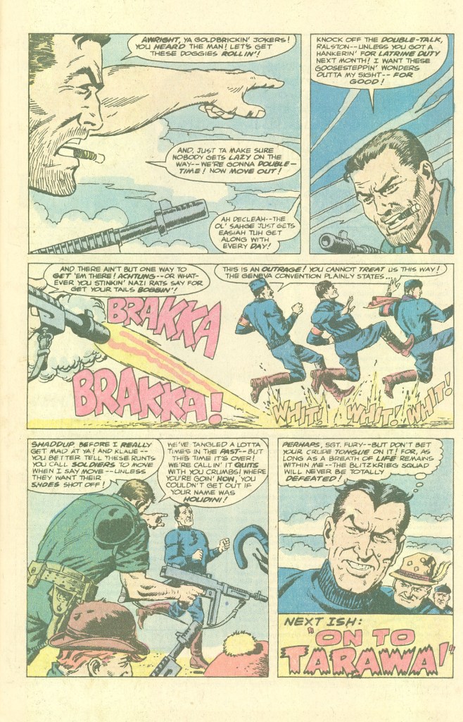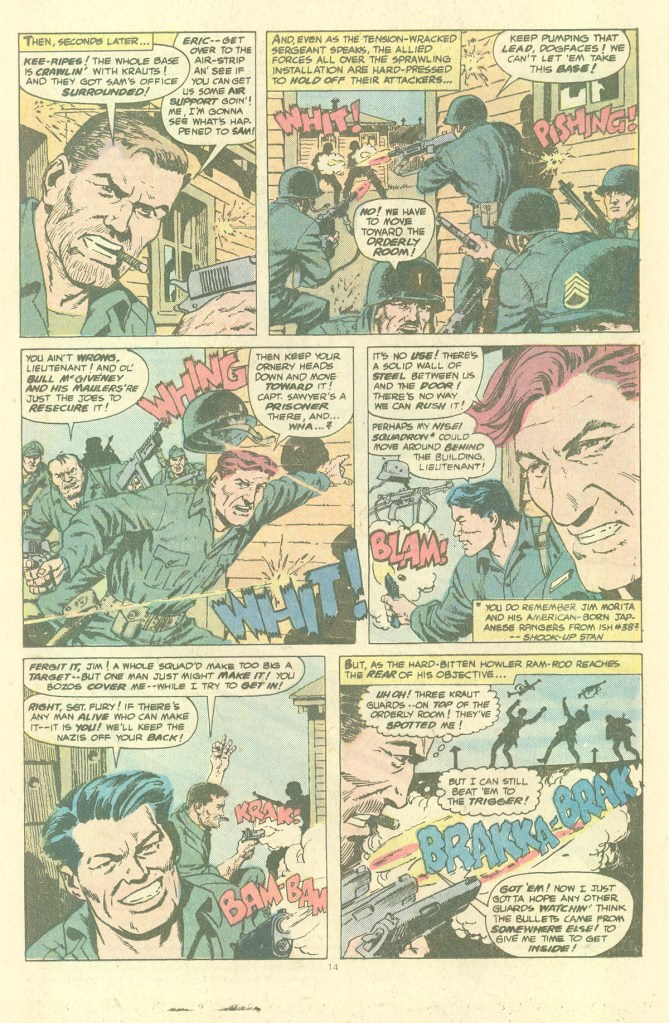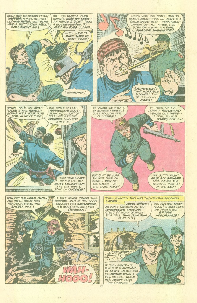 So it’s a grudge match battle between the two groups–and we’re not even going to get into how absurd it is that a seven-man team of Nazis can not only stroll into the Howlers’ base but take it over so completely. This was nothing that the Howlers themselves hadn’t done a dozen times in reverse in previous stories, so we’ll give the Blitzers some credit. Colonel Klaue is able to capture the squad’s C.O., Happy Sam Sawyer, which means it’s up to fury and the boys to recover him unharmed. Apart from that, much of the narrative is about bouncing the Howlers and their Nazi counterparts off of one another. I must admit, I have to love the ridiculous duel between Howler Gabe Jones and his rival, Otto, who use their musical instruments as weapons against one another (“It’s a cinch that Otto won’t think about chasin’ us! Not after I cut down on him with a real Harlem high note!”) It’s patently absurd, even within the broad context of this series, and that makes me admire it for it’s gumption. Again, this is closer to a super hero fight than any genuine military battle.