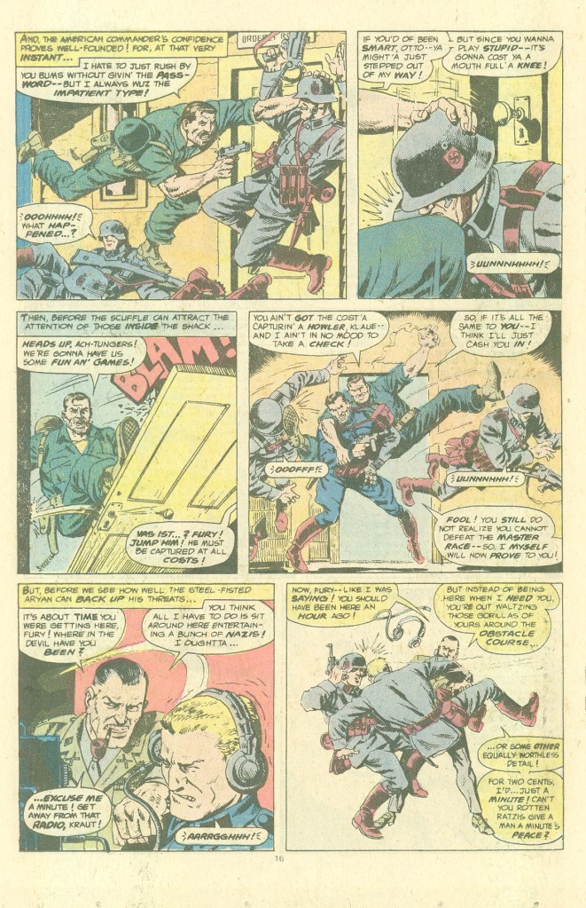 I just reread the issue where Fury’s sweetheart Pam Hawley dies and it packs some punch. But then we get Fury taking revenge next issue and the characterization of the Luftwaffe leader behind the attack that killed her is laughable, malevolently gloating about killing off innocent women and children as if he were Captain Nazi in a WW III Captain Marvel comic (Roy Thomas parodied the buffoon portrayal of the Axis in his 1980s Alter Ego comic).