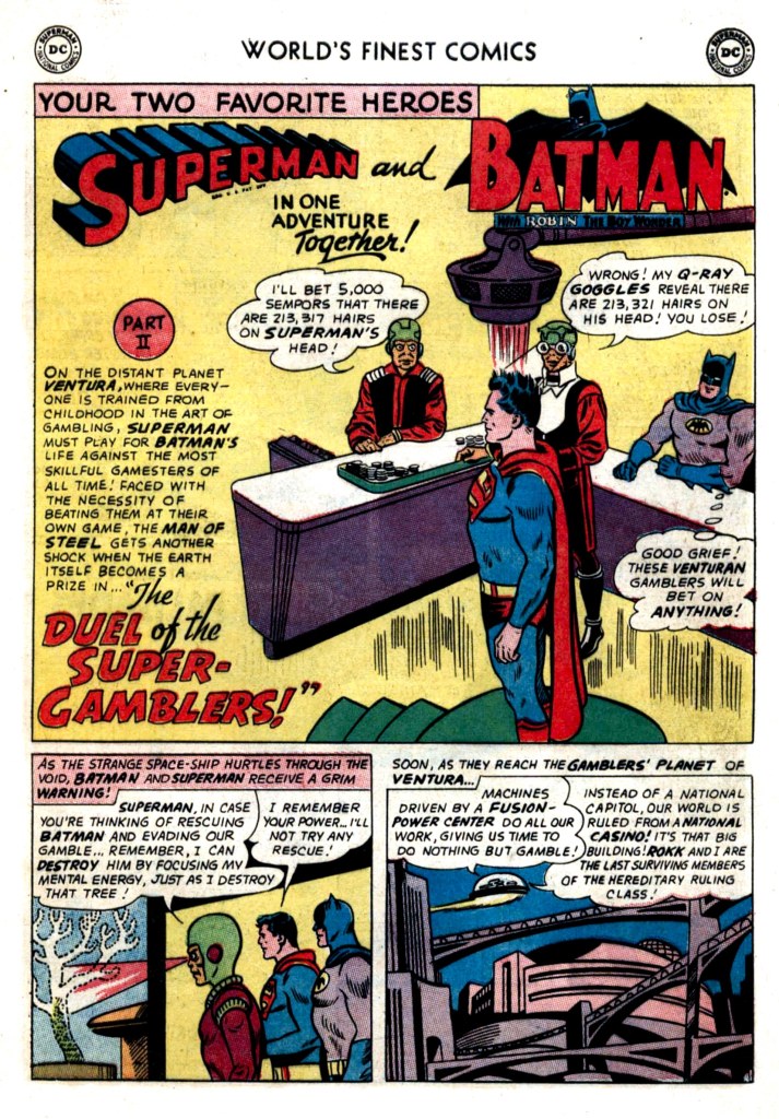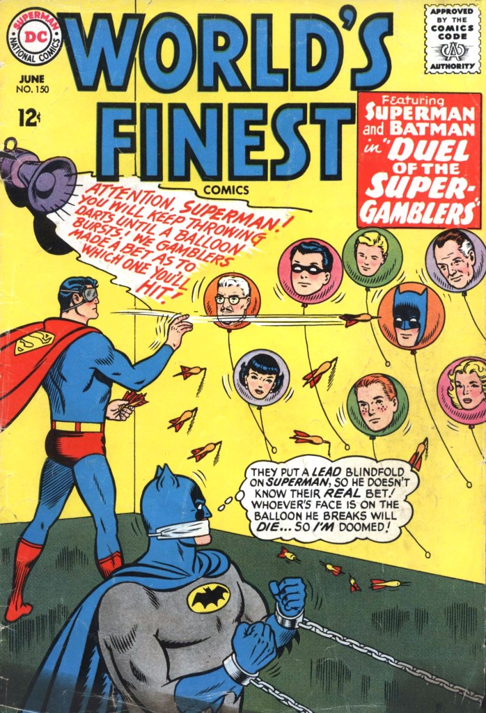 This issue of WORLD’S FINEST COMICS was released after a recent editorial shake-up at DC, one which saw editor Julie schwartz taking over the Batman titles from Jack Schiff. The singular exception was WORLD’S FINEST, which instead was delivered into the hands of Superman editor Mort Weisinger. Which makes sense–Mort’s books were the top-sellers in the line, and Superman comprised one half of the lead feature in this series. Mort wasted no time in bringing the series into line with his other Superman books, reflecting the complex mythology he’d been shepherding for the character. Batman and Robin became almost something of an afterthought, at least for a while–though when the BATMAN television series hit the airwaves and was an enormous hit, Mort wasn’t at all opposed to taking advantage of the Caped crusader’s increased popularity.
