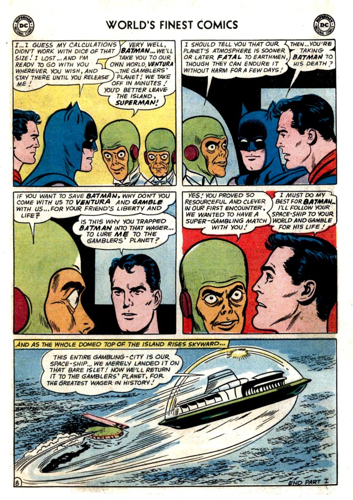 This story features Rokk and Sorban, a pair of intergalactic gamblers from the planet Ventura. I remembered them from a subsequent appearance when they bet on the second race between Superman and the Flash. The story begins with a friend of Batman’s having lost a small fortune in charity money at the newly-established Gambler’s Island. Leaving Robin behind (because as a minor, he’s not permitted on Gambler’s Island) Batman investigates the place and its amazing games of chance. But none of them are rigged as far as he can ascertain. While he’s there, Batman attempts to win back the lost charity money. But in his final game, he’s forced to accompany his hosts wherever they wish after a losing roll. The two owners are revealed to be Rokk and Sorban, who have encountered Superman before. And this whole affair has been a ploy to lure Superman back to Ventura in order to gamble with him. The atmosphere of Ventura is slowly poisonous to human beings, so superman will need to win his friend’s freedom in gambling competitions before he perishes.