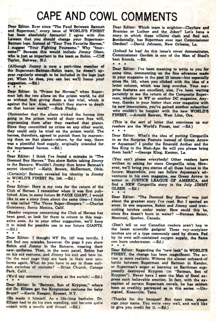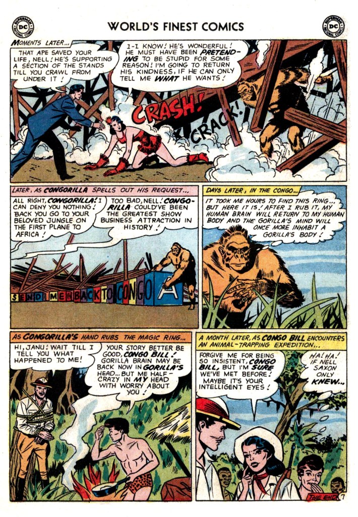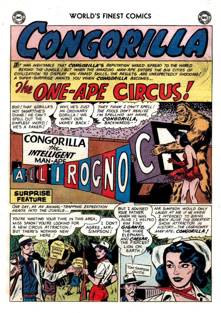 Also during this period, Mort began running a “surprise feature” as the back-up story in every issue. This feature, sometimes referred to as a “demand classic” or a selection from the “Editor’s Round Table” was actually a reprint, a cost- and labor-saving effort. I don’t know that WORLD’S FINEST COMICS’ sales were so poor that they had to resort to such measures–one rather gets the sense that taking on WORLD’S FINEST was seem by Mort as an imposition, and one that he didn’t want to spend all that much time on. This particular issue reprints a six year old Congorilla story by Robert Bernstein and Howard Sherman from the pages of ACTION COMICS.