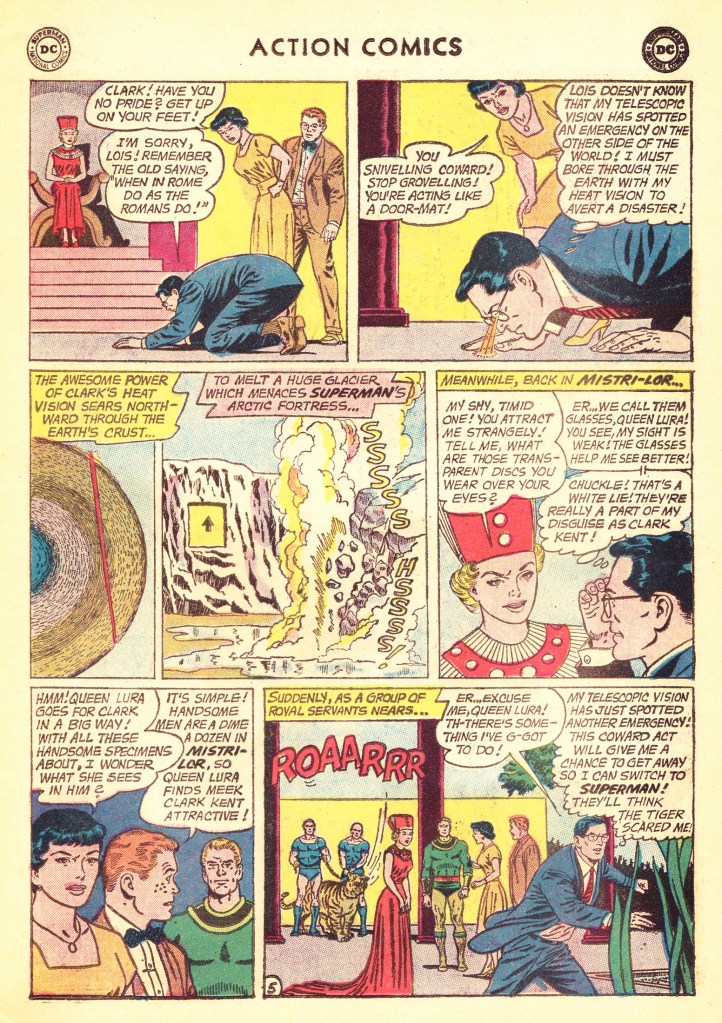 The story opens with Daily Planet reporters Clark Kent, Lois Lane and Jimmy Olsen taking a closer look at a hot air balloon the “Balloon Gang” used in a recent getaway. Clutzy Jimmy winds up untethering the balloon while the trip are inside it, causing it to take off wildly. Jimmy wants to use his signal watch to contact Superman for help, but Lois senses a story in this (“Daily Planet Reports Are Idiots!”) and keeps him from doing so. But the sort of fluke these stories specialize in, the runaway balloon winds up carrying the reporters to a lost civilization hidden in the mountainside. The trio is captured by the city’s guards, but their Queen Lura takes a liking to Clark. In a series of outlandish coincidences, Clark appears to court Lura when he’s actually using his secret super-powers to handle crises that are happening all over the world despite being trapped here. Prince Vikar, who is betrothed to Lura, isn’t a fan of this, and he challenges Clark to a duel.