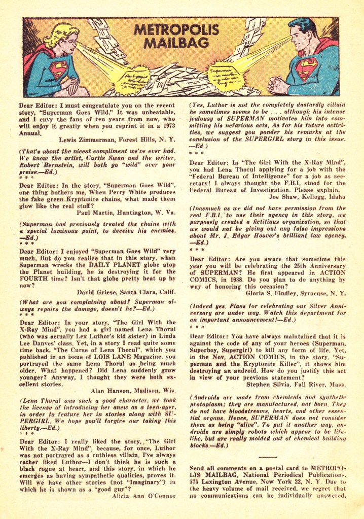 At the midpoint of the book came the Metropolis Mailbag letters page, still pitching its questions and answers at relatively young readers. You can tell how popular Supergirl was becoming in that she’s been included in the header to the page by this time. Mort’s audience was still trying to catch him out on goofs, which was a seeming regular pastime on his letters pages. Here, one asks him about a returning character, Lena Thorul, who had earlier appeared in a LOIS LANE adventure as a much older character. Mort is uncharacteristically straightforward about the fact that they thought the character had potential and decided to de-age her so that she would better fit in with Supergirl’s world.