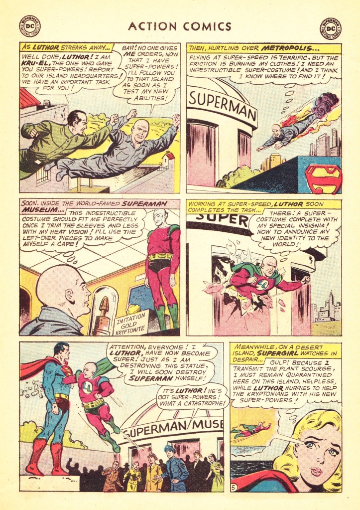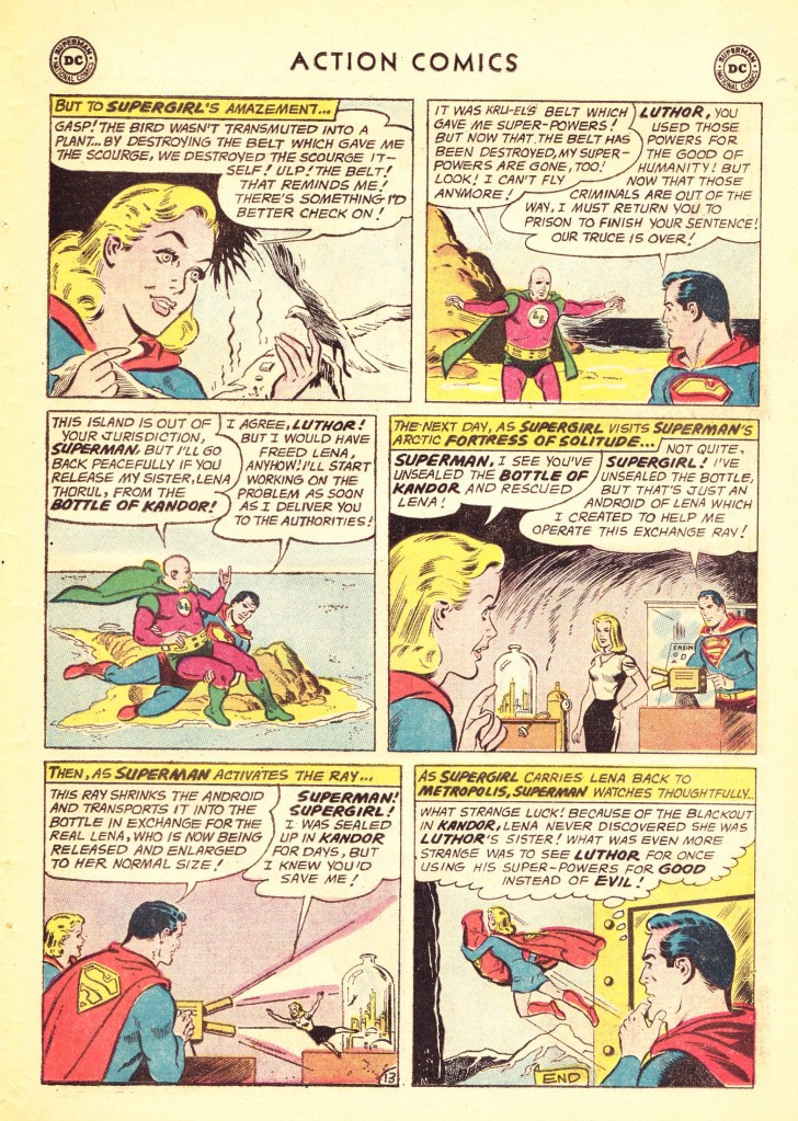 Not only was the Supergirl story in this issue featured on the cover this month, but it was also a page longer than the lead Superman story. It also guest-stars Superman, albeit to a limited degree. It was also written by Leo Dorfman, and illustrated (and signed in the splash panel–a rare thing in a Weisinger book) by regular Supergirl artist Jim Mooney, and it’s something of a tour de force. It’s presented here as a stand-alone story, but really it’s a continuation of the Supergirl adventure from last month. Last time, Supergirl’s recurring foe Lesla-Lar had trapped Lena Thorul in the Bottle City of Kandor, released a number of Phantom Zone criminals onto Earth, exposed Supergirl to a plague that made her a dangerous carrier which forced her to exile herself on a remote island, and then took steps to prevent aid from Superman or any of Supergirl’s other allies, such as the Legion of Super-Heroes. With nowhere else to turn, the Maid of Steel reached out to her cousin’s arch-enemy Lex Luthor for help.