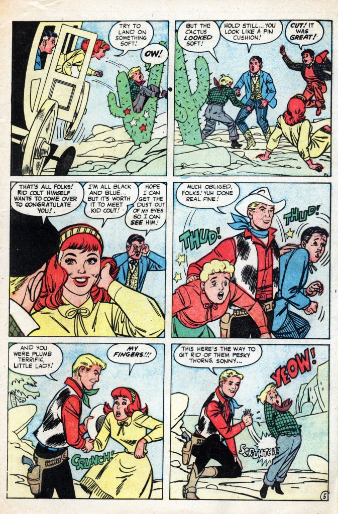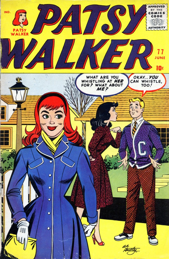It became one of the hallmarks of the new Marvel line of super heroes to have characters from different series casually crossing over and encountering one another. But that wasn’t a new thing for editor Stan Lee, who had been using such stories to cross-promote other titles in the proto-Marvel line. This story from PATSY WALKER #77 wasn’t the first, but it was among them. It isn’t cover-blurbed in any way, but in this issue Centerville’s most popular teen-ager met the western hero Kid Colt, Outlaw. Both Colt and Patsy were among the longest running regular characters Atlas had, so this point of intersection held some significance.