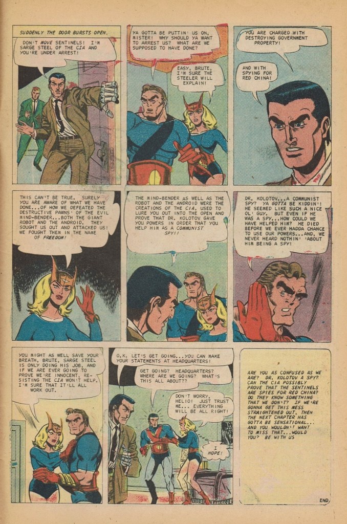 The back-up story was much more to my liking, and is a sentimental favorite even now. This was the Sentinels, Charlton’s attempt to mimic the Marvel style of storytelling. And for all its crudity, it was a pretty credible attempt. The Sentinels were a trio of young people each gifted with a high-tech device that granted them super-powers, so that they could stop the mysterious criminal mastermind Mind-Bender. The leader, Helio, could fly, Mentalia possessed the ability to read minds (and eventually developed some telekinesis when that proved too limiting) and the Brute was just plain ol’ strong. Oh, and they were also a band of folk singers as well, believe it or not. They were a smudged xerox copy of the Fantastic Four, and so I liked them even despite their derivativeness (or quite possibly because of it.) I wrote about the series a bit more extensively here.