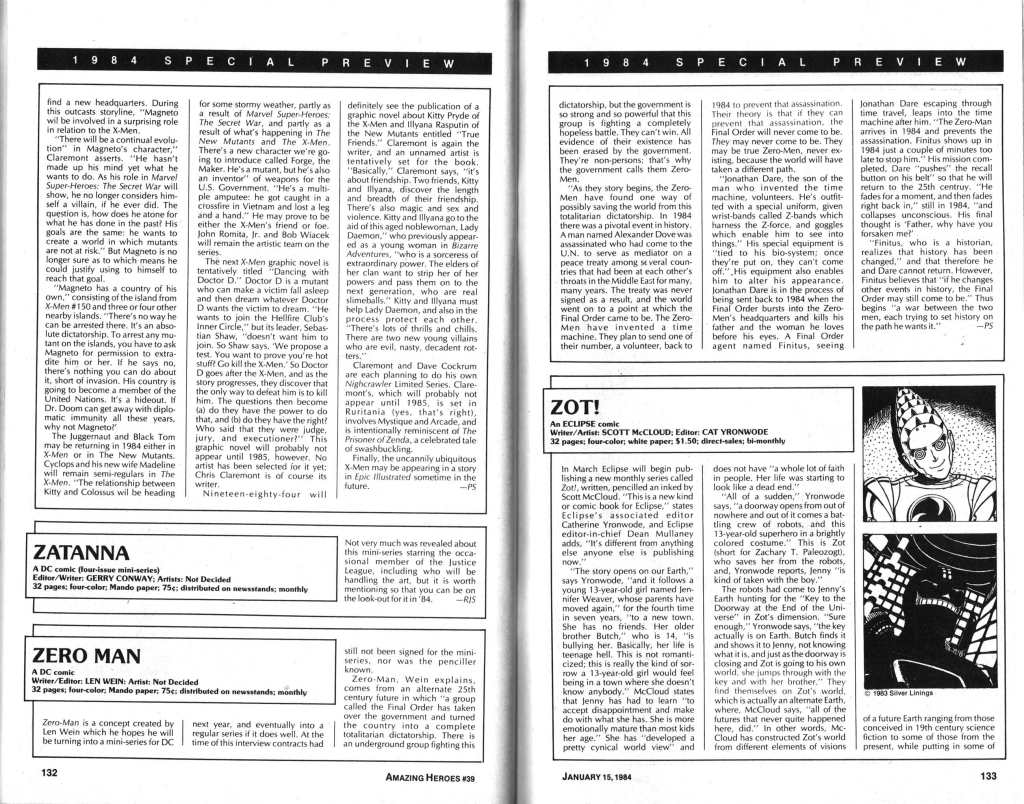 A bunch of the projects and storylines talked about in this X-MEN write-up either never happened or came about years and years later. TRUE FRIENDS eventually saw print as a limited series a decade-plus later, while the Doctor D. story never happened at all. Neither did the Chris Claremont-led NIGHTCRAWLER limited series. I believe this particular ZATANNA limited series never came out as well. The same is true of ZERO MAN, which never happened at all.
