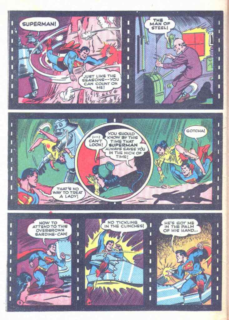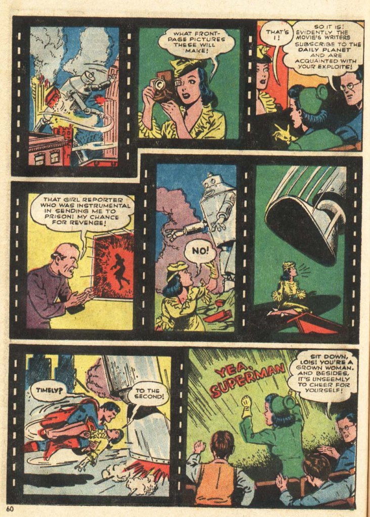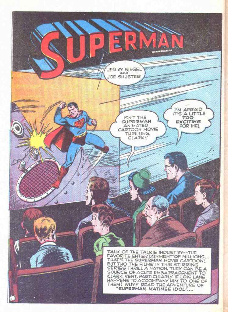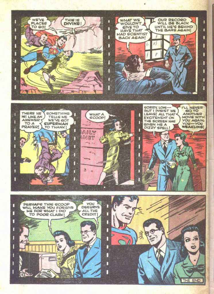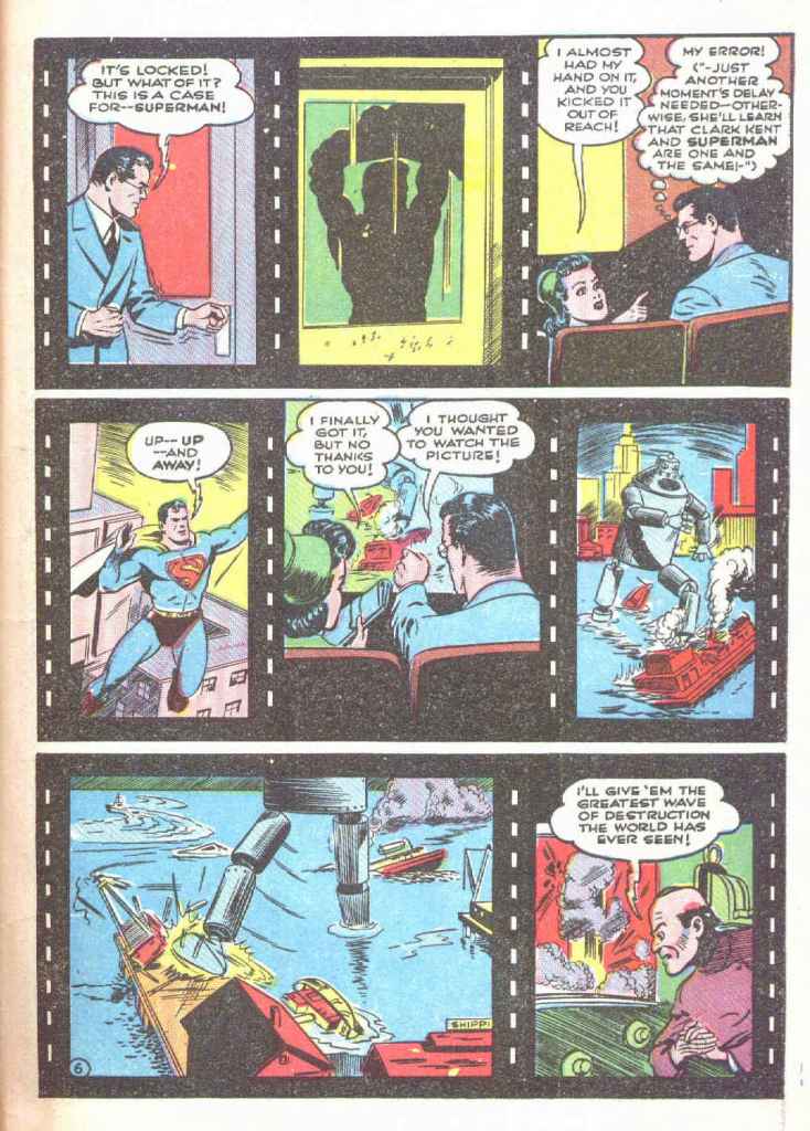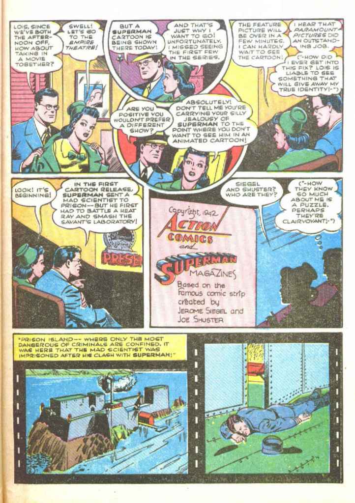 That first Superman cartoon (named simply SUPERMAN but often colloquially referred to by historians as “The Mad Scientist”) was released to theaters nationwide on September 26, 1941. In an effort to promote the film, Superman’s creator Jerry Siegel was tapped to write a story that would function as a sequel to that adventure. It appeared in SUPERMAN #19, which went on sale on August 30, 1942, almost a year later. Consequently–whether it was Siegel’s idea or something discussed between him and editor Whit Ellsworth–Siegel took an interesting and meta approach to teh material. In the story, Lois Lane convinces Clark Kent to accompany her to the movies, where a Superman cartoon is playing. But because the cartoon will spoil the secret of his true identity, Clark must divert Lois’ attention at a few key moments in order to protect his closely-guarded secret. Now, Clark wasn’t worried about anybody else in the theater learning his true identity, any more than he was about the actual audiences reading the comic book. It was just a fun bit of narrative business that was used to frame the story and promote the cartoon features. The story was illustrated by Shuster Studios ghost artist Ed Dobrotka. There’s some dispute about whether or not Joe Shuster may have laid this story out, but Dobrotka certainly produced the finished artwork.