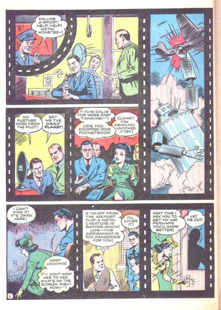 The second page featured some alterations as well. In specific, in the fifth panel, Jerry Siegel and Joe Shuster’s byline is removed from the film as well, and Lois’ comment wondering who they are is instead replaced by one indicating that she’s never heard of ACTION COMICS or SUPERMAN magazine.