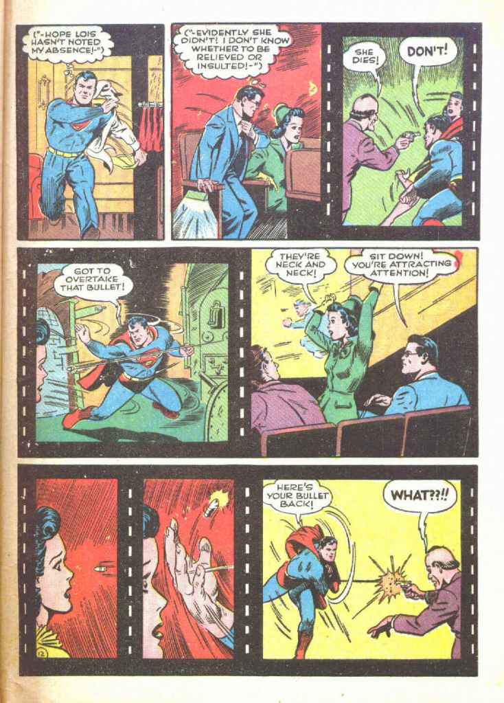 And here on PAGE 11, the printing in SUPERMAN #183 makes a substantial cut, no doubt to fit teh story into the available page length. A bit of business where Clark hears a ruckus outside, changes into Superman, stops a getaway car and then gets back to his seat without Lois noticing his absence because she’s so enthralled by teh cartoon is eliminated from both future printings.