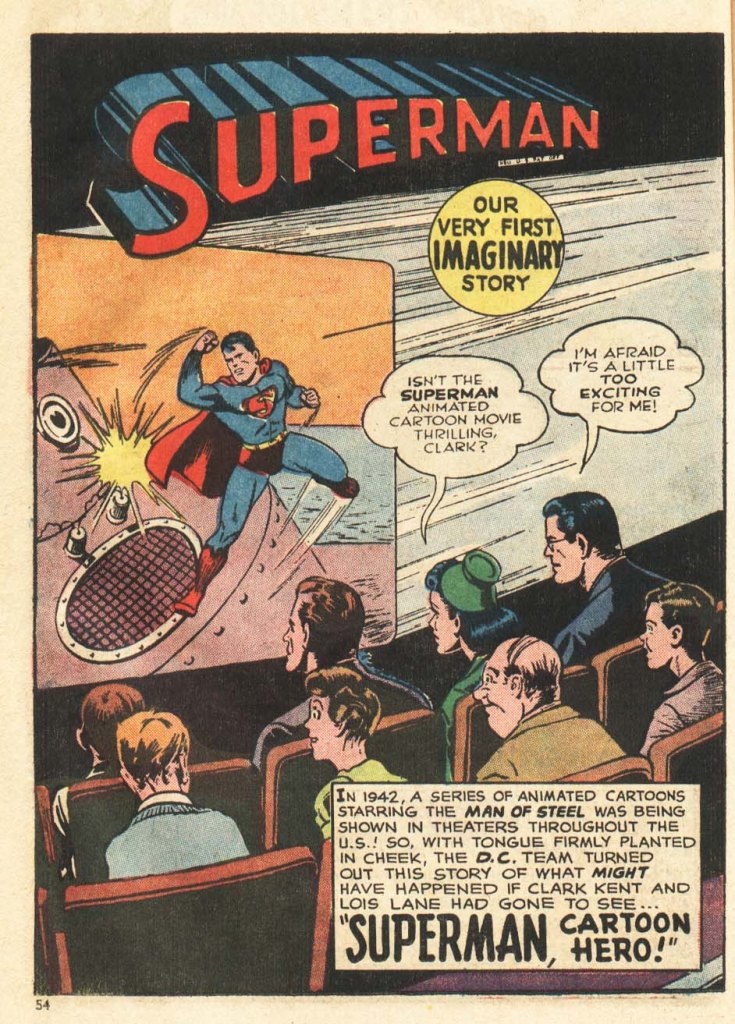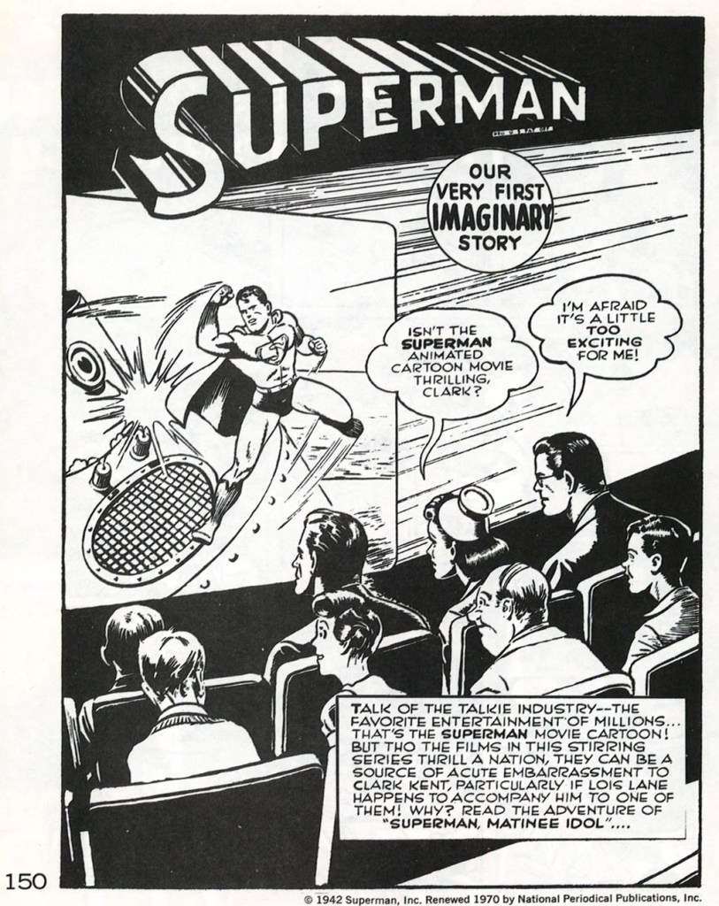 In SUPERMAN #183, editor Weisinger had the byline for Jerry Siegel and Joe Shuster removed from the splash page. In order to cover its deletion, he added a blurb declaring it to be “Our Very First Imaginary Story!” Imaginary Stories had become one of the recurring motifs in Mort’s Superman line of titles, tales in which things were permitted to happen that would have altered the character permanently if they hadn’t been expressly declared non-canonical. Mort (or possibly Bridwell, who was working as Weisinger’s Assistant Editor at the time) wrote up a new opening caption to explain the story to audiences of 1965. He also changed the title from “Superman, Matinee Idol” to “Superman, Cartoon Hero” since the term Matinee Idol had fallen into disuse. Bridwell restored the original caption and title for SUPERMAN FROM THE ’30s TO THE ’70s, but he maintained the blurb about it being an Imaginary Story, and Siegel & Shuster’s byline remained removed.