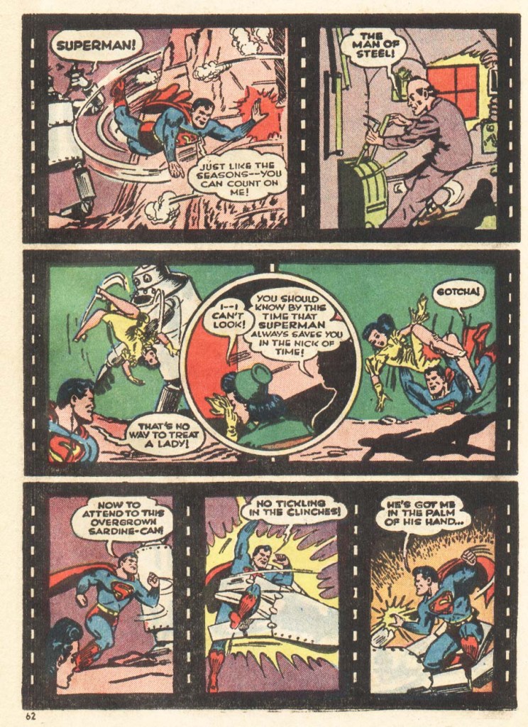 I do wonder if Bridwell just ended up using the reprinted version for From The ’30s to the ’70s because it was immediately to hand and made the minimal intervention to restore the original title caption. Only one other story in in that collection obliterates Jerry and Joe’s credit from the comics they produced in it (though ENB calls Siegel and Shuster “the creators” in his introduction), so I can’t help but think it just used the same films as from the 1960s reprint.