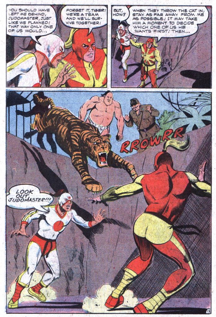 Rather than straight out kill the pair, Mountain Storm and his commander Suzuki instead opt to drop a live tiger into the pit with the costumed dup. The tiger seems to have a taste for his costumed namesake, but Judomaster is able to stun it with a blow from behind, then he and Tiger are able to acrobat their way out of the pit–the watching Japanese soldiers apparently too stunned by this swift reversal of events to do anything about it. Judomaster clobbers the soldiers, knocking some of them into the tiger pit intended for himself, and then he and Tiger skedaddle, since the story is entirely out of pages. It’s an abrupt and pretty unsatisfying ending all around, honestly. McLaughlin’s artwork is nice enough, but a bit too open and empty for my tastes. There’s a lot of dead space in these panels, and the action isn’t quite kinetic enough. It’s perfectly fine, but nothing to write home about.