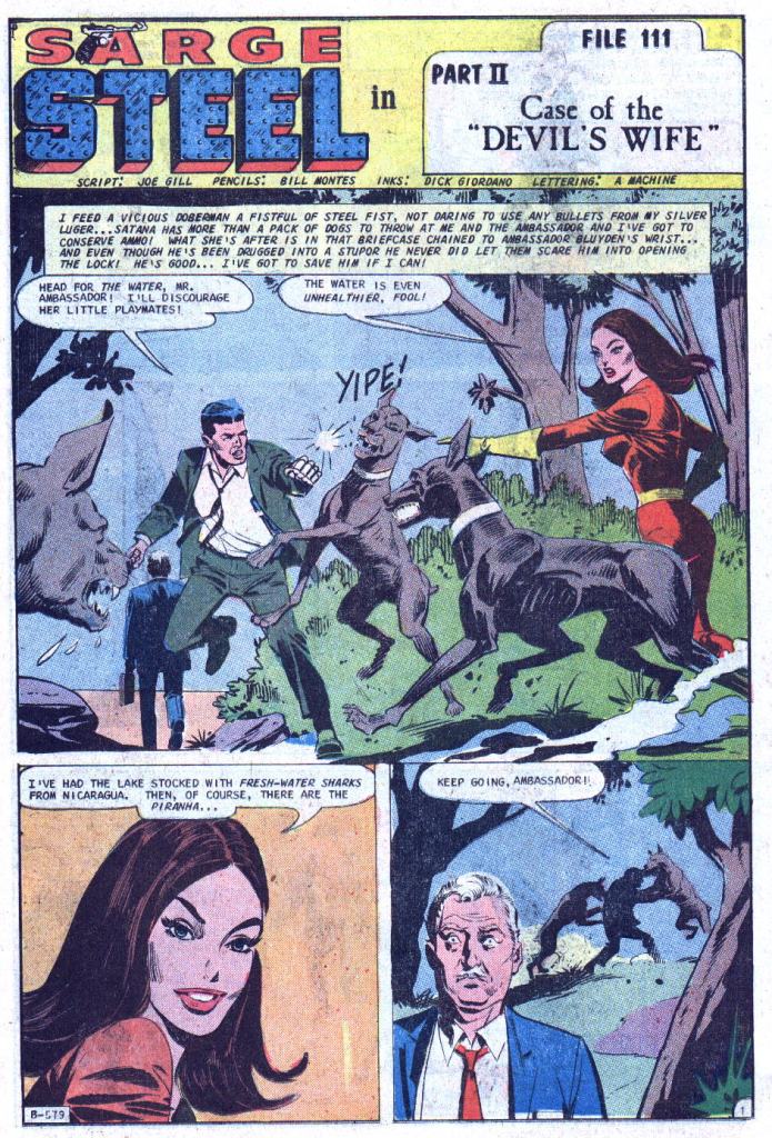 Following a two-page filler strip about karate masters battling bulls with their skills (seriously!) that isn’t really worth mentioning, the back-up slot is occupied with another adventure of Sarge Steel, a private eye/super-spy series that had held its own series and which appears to have been a real favorite of editor Dick Giordano. Steel is so named because his left hand has been replaced with a metal prosthetic, but otherwise he displays no superhuman traits. He’s just a tough dick/tough agent making his way through a dangerous world (depending on what strip at what part of the character’s development you happened to read.) This story was written by workhorse Joe Gill and penciled by Bill Montes, with Giordano providing the inks to the final artwork. It was also lettered by Charlton’s lettering machine, which meant that the copy all looked a bit mechanical and uninviting. Charlton really liked that machine, and used it on and off for years, despite the fact that it made their product look shabby.
